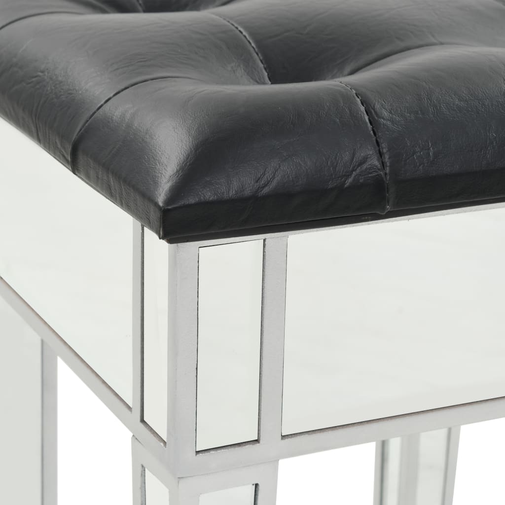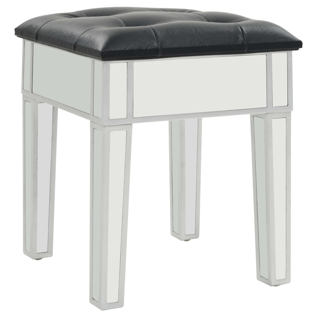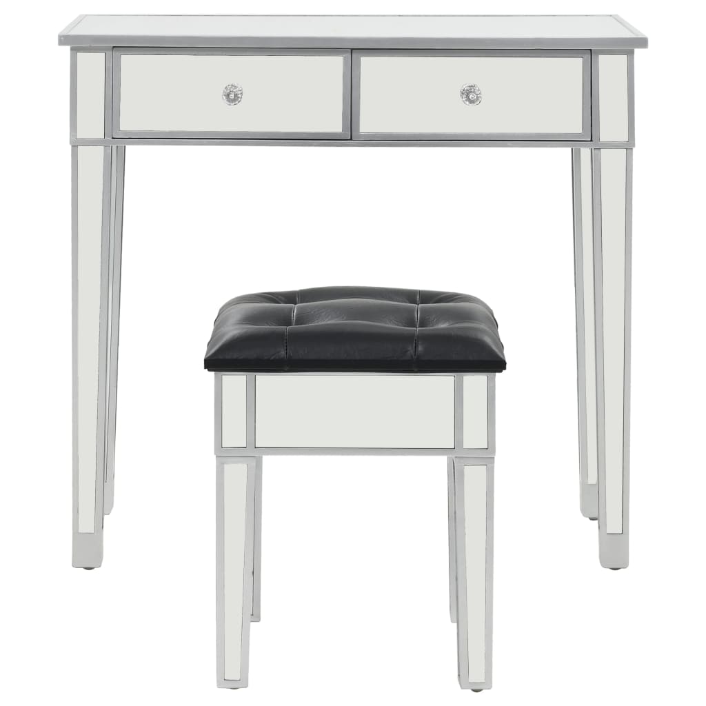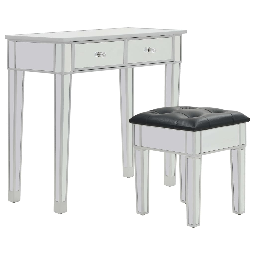 Der verspiegelte Frisiertisch und der Hocker verleihen Ihrer Einrichtung einen Hauch von Eleganz. Das Make-up-Tischset ist mit glattem Spiegelglas verziert und strahlt eine raffinierte Atmosphäre aus. Der Schminktisch und der Hocker haben einen stabilen MDF-Rahmen. Die zwei Schubladen bieten Platz für alle Arten von kleineren Gegenständen. Der Schminktisch kann auch als Konsolentisch, Flurtisch, Schreibtisch usw. verwendet werden. Dank der verspiegelten Oberfläche wertet das Tischset Ihr Interieur sofort auf und sorgt für ein geräumiges Raumgefühl. Die Faux-Kristall-Knöpfe verleihen einem eleganten Charme und erleichtern das Öffnen der Schubladen. Der Sitz ist mit Kunstleder bezogen, um höchsten Komfort zu bieten und luxuriös zu wirken. Der Tisch und der Hocker sind kinderleicht zu montieren.