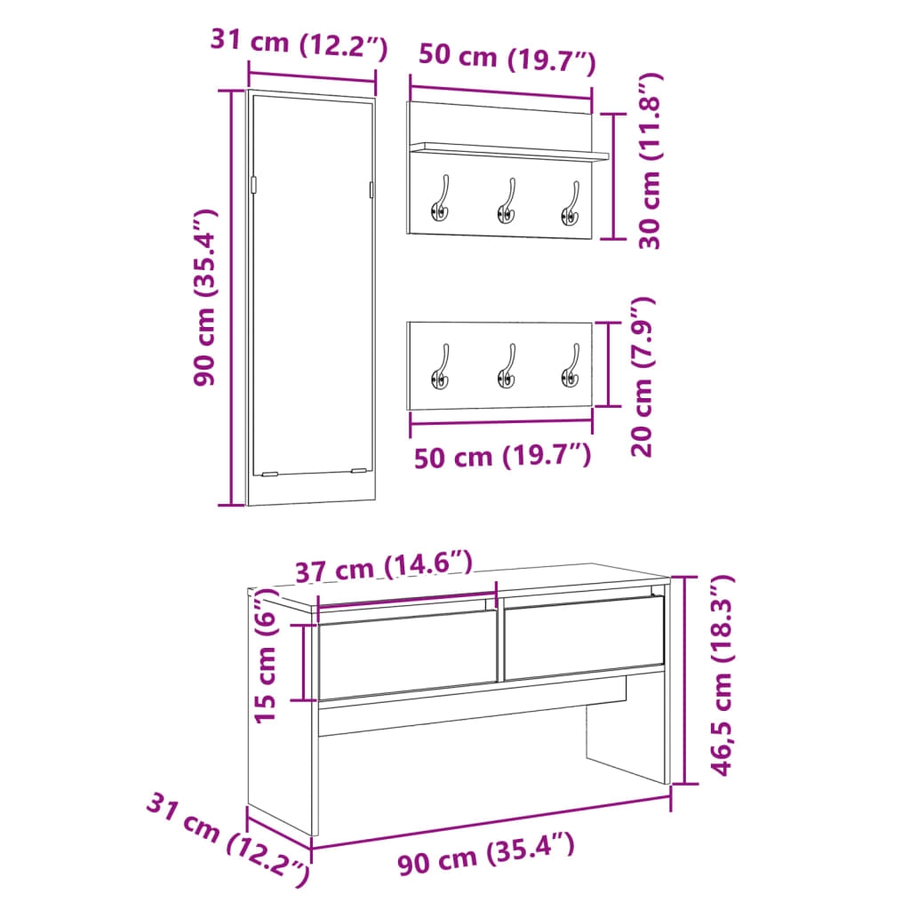 Schaffe eine warme und einladende Atmosphäre in deinem Eingangsbereich mit dieser Garderobe! Starkes und langlebiges Material: Holzwerkstoff ist ein langlebiges und robustes Material mit einer glatten Oberfläche, das gegen Feuchtigkeit, Verformung und Rissbildung beständig ist, wodurch es eine zuverlässigen Wahl für die Herstellung von Möbeln ist.3-in-1 Stauraum im Flur: Dieses Flurmöbel-Set enthält alles, was du brauchst, um deinen Eingangsbereich sauber und ordentlich zu halten. Es beinhaltet eine Schuhbank mit Schubladen, einen Spiegel und zwei Garderobenleisten – perfekt für die Aufbewahrung von Schuhen, Mänteln und Accessoires.Multifunktionale Flurbank: Diese vielseitige Schuhbank ist sowohl ein schönes Möbelstück zur Schuhaufbewahrung als auch als praktischer Ort, an dem du deine Schuhe an- oder ausziehen kannst.6 Garderobenhaken: Die 6 Kleiderhaken sind auf zwei verschiedenen Höhen angebracht, um Kleidung unterschiedlicher Länge aufnehmen zu können.Platzsparend: Die Wandgarderobe maximiert den ungenutzten Platz an der Wand und bietet kompakten und effizienten Stauraum, wodurch sich diese Möbel für den Flur ideal für kleine oder begrenzte Räume eignen.