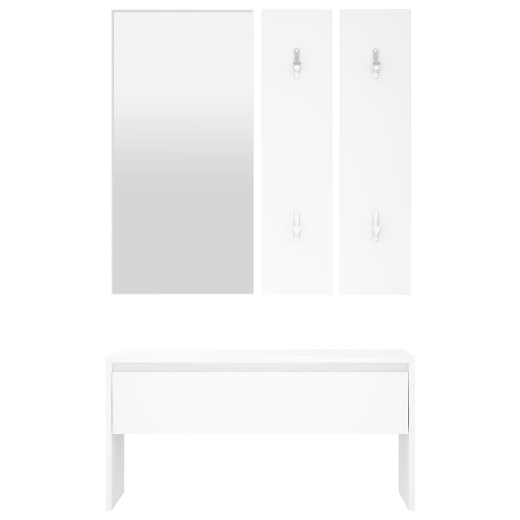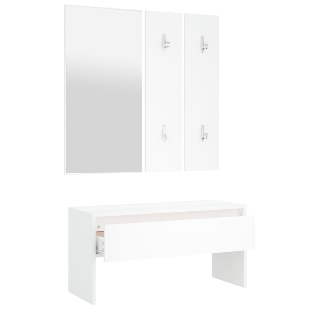 Schaffe eine warme und einladende Atmosphäre direkt neben deiner Tür mit diesem Flurmöbel-Set! Robustes Material: Holzwerkstoff ist ein Material von außergewöhnlicher Qualität mit glatter Oberfläche, das sich durch Festigkeit, Stabilität und Feuchtigkeitsbeständigkeit auszeichnet.Reichlich Stauraum: Die Flurbank mit Schublade bietet reichlich Stauraum für Schuhe oder andere Utensilien.Multifunktionale Bank: Die Bank bietet Stauraum und Platz, um Dekoartikel in deinem Wohnraum zur Schau zu stellen, kann aber auch als Sitzgelegenheit beim An- und Ausziehen der Schuhe dienen.Praktisches Design: Die Kleiderhaken bieten Platz zum Aufhängen deiner Kleidung. Dabei kannst du auch einen Blick in den Spiegel werfen. Hinweis:Jedes Produkt wird mit einer Montageanleitung in der Verpackung für eine einfache Montage geliefert.Schrauben und Dübel für die Wandbefestigung sind nicht enthalten. Suchen und verwenden Sie die für Ihre Wände geeigneten Schrauben und Dübel. Wenn Sie unsicher sind, suchen Sie professionelle Hilfe. Lesen und befolgen Sie jeden Schritt der Anleitung sorgfältig.