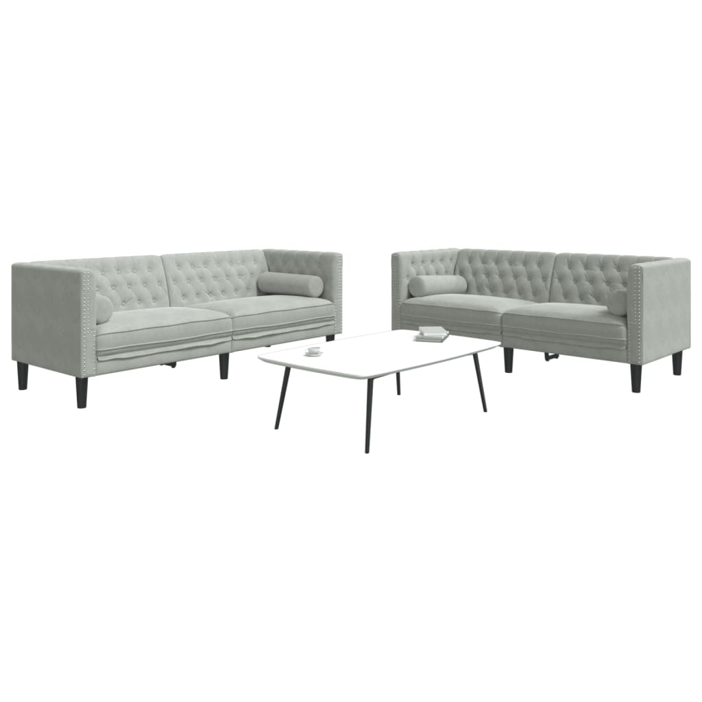 Diese Chesterfield-Sofas bietet den idealen Platz zum Plaudern, Lesen, Fernsehen oder einfach nur zum Entspannen. Die Sofagarnitur wird ein echter Blickfang in deinem Zuhause sein. Weiches und komfortables Material: Der Samtstoff hat eine weiche und sanfte Oberfläche, die sich angenehm auf der Haut anfühlt und höchsten Komfort bietet.Bequemes Sitzerlebnis: Dank der dick gepolsterten Sitzflächen, Armlehnen und Rückenkissen ist das Sofa sehr bequem. Die im Lieferumfang enthaltenen Nackenrollen verschönern nicht nur deine Einrichtung, sondern werden auch zusätzlichen Sitz- und Liegekomfort bieten.Chesterfield-Stil: Mit dem klassischen Rückenlehne und den Armlehnen mit Knopftuft und einer einheitlichen Rücken- und Armhöhe wertet das Sofa jeden Wohnraum auf und bietet sowohl Stil als auch Komfort.Stützbeine: Der Polstersessel wird von stabilen Beinen getragen, die seine Stabilität und Standfestigkeit gewährleisten.