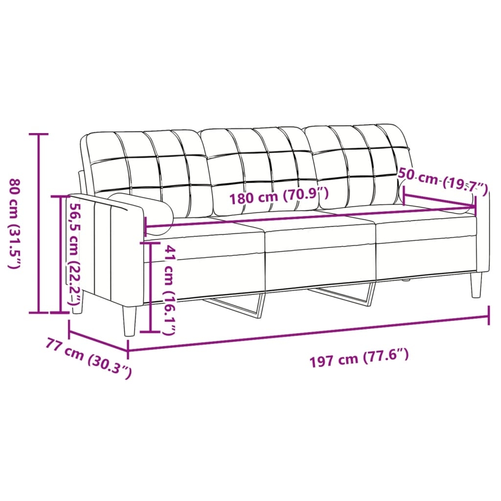 Dieses 3-Sitzer-Sofa bietet einen ausgezeichneten Platz zum Plaudern, Lesen, Fernsehen oder einfach nur zum Entspannen. Es wird ein echter Blickfang in deinem Zuhause sein. Weiches und komfortables Material: Der Samtstoff hat eine weiche und sanfte Oberfläche, die sich angenehm auf der Haut anfühlt und höchsten Komfort bietet.Robustes und stabiles Gestell: Das Metallgestell verleiht dem Sofa Robustheit und Stabilität.Bequemes Sitzerlebnis: Dank der dick gepolsterten Sitzflächen, der Armlehnen und der Rückenkissen ist das Sofa sehr bequem.Abnehmbare Kissenbezüge: Dank des Reißverschlusses lassen sich die Bezüge dieser Kissen bei Bedarf leicht abnehmen und reinigen.Auffälliges Design: Mit seinem schlichten und dennoch modernen Design ist dieses Sofa ein echter Hingucker in deinem Zimmer.
