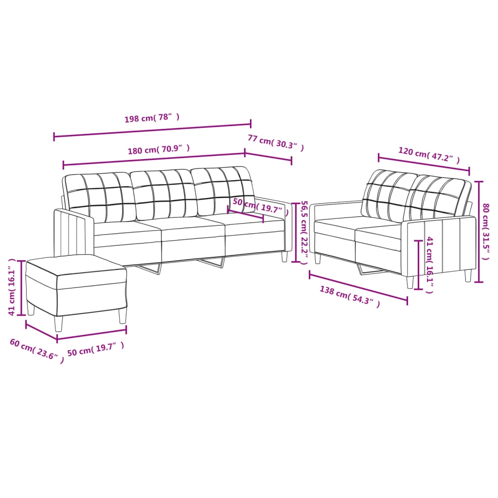 Diese Sofagarnitur bietet einen ausgezeichneten Platz zum Plaudern, Lesen, Fernsehen oder einfach nur zum Entspannen. Sie wird ein echter Blickfang in deinem Zuhause sein. Strapazierfähiger Stoff: Der Stoff zeichnet sich durch einen schlichten und sauberen Look aus und ist gleichzeitig atmungsaktiv und langlebig.Robustes und stabiles Gestell: Das Gestell aus Sperrholz und Metall verleiht der Sofagarnitur Robustheit und Stabilität.Bequemes Sitzerlebnis: Mit dick gepolsterten Sitzflächen, Armlehnen und Rückenkissen versehen, ist das Sofa sehr bequem.Vielseitiger Fußhocker: Der Hocker eignet sich zum Ausruhen der Füße beim Liegen auf dem Sofa, kann aber auch als zusätzliche Sitzgelegenheit in deinem Zimmer dienen. Darüber hinaus eignet er sich durch sein schlichtes Design und seine kompakte Größe für fast alle Wohnräume.