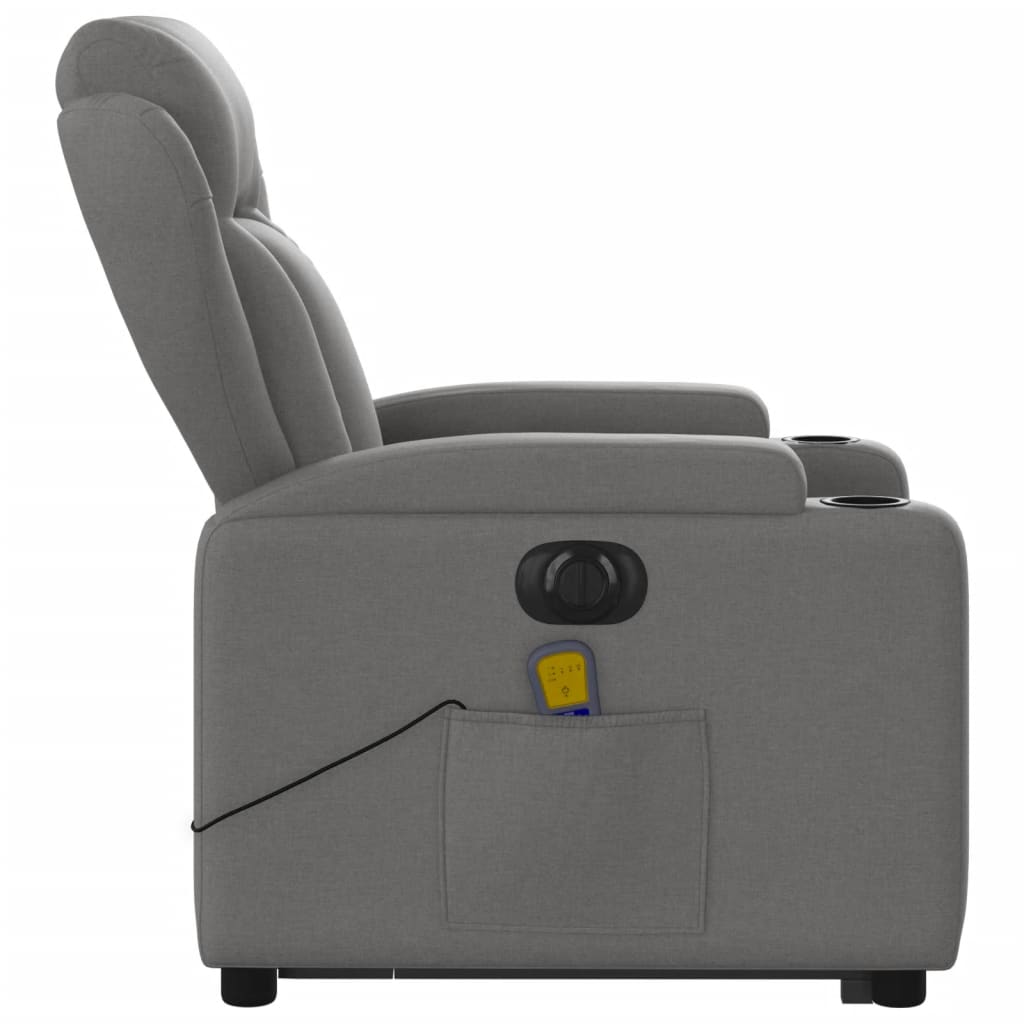 Lehne dich zurück und entspanne dich in diesem äußerst bequemen elektrischen Massagesessel mit Aufstehhilfe! Elektrische Aufstehhilfe: Dieser Relaxsessel ist mit einem Elektromotor zum Anheben ausgestattet. Dank der Aufstehhilfe, die den gesamten Sessel nach oben bringt, kannst du ganz einfach auf Knopfdruck aufstehen, ohne deinen Rücken und deine Knie zu belasten.Elektrische Liegefunktion: Dieser Relaxsessel ist mit einem Elektromotor ausgestattet, der Fußstütze und Rückenlehne durch einfaches Drücken des seitlichen Knopfes automatisch in jede gewünschte Position bringt. Diese Funktion ermöglicht eine maximale Neigung von 135 Grad. Darüber hinaus lässt sich die Rückenlehne auf Knopfdruck automatisch in die ursprünglichen Position zurückbringen.Vibrationsfunktion: Dank der 6 Massagepunkte genießt du eine gezielte Massage. Zudem lassen sich verschiedene Massageprogramme über die mitgelieferte Handsteuerung auswählen. Die Massagefunktion wird über den USB-Anschluss betrieben, der eine zertifizierte 5-V-USB-Stromquelle erfordert (nicht im Lieferumfang enthalten).Bequemes Sitzerlebnis: Die dick gepolsterte Sitzfläche, die Rückenlehne und die breiten Armlehnen sorgen für ein behagliches und wohliges Sitzgefühl. Der Bezug aus Stoff weist eine schlichte und saubere Optik auf und ist auch atmungsaktiv und langlebig.Praktische Getränkehalter und Seitentasche: Dieser Sessel verfügt über zwei praktische Becherhalter und eine Seitentasche, in der du wichtige Sachen griffbereit aufbewahren kannst.Solider und stabiler Rahmen: Der Rahmen aus Holz und Metall sorgt für eine solide Struktur und hohe Stabilität. Dieser TV-Sessel ist bequem und langlebig.
