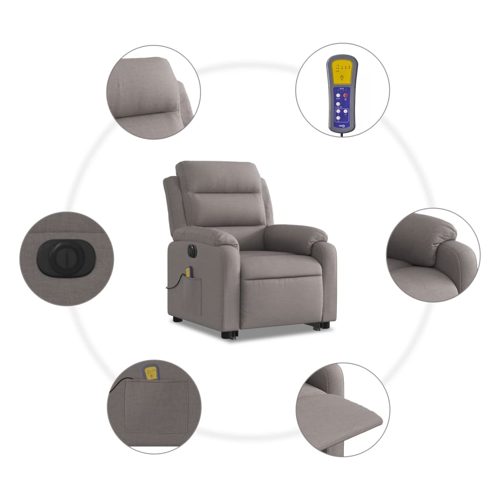 Lehne dich zurück und entspanne dich in diesem äußerst bequemen elektrischen Massagesessel mit Aufstehhilfe! Elektrische Aufstehhilfe: Dieser Relaxsessel ist mit einem Elektromotor zum Anheben ausgestattet. Dank der Aufstehhilfe, die den gesamten Sessel nach oben bringt, kannst du ganz einfach auf Knopfdruck aufstehen, ohne deinen Rücken und deine Knie zu belasten.Elektrische Liegefunktion: Dieser Relaxsessel ist mit einem Elektromotor ausgestattet, der Fußstütze und Rückenlehne durch einfaches Drücken des seitlichen Knopfes automatisch in jede gewünschte Position bringt. Diese Funktion ermöglicht eine maximale Neigung von 135 Grad. Darüber hinaus lässt sich die Rückenlehne auf Knopfdruck automatisch in die ursprünglichen Position zurückbringen.Vibrationsfunktion: Dank der 6 Massagepunkte genießt du eine gezielte Massage. Zudem lassen sich verschiedene Massageprogramme über die mitgelieferte Handsteuerung auswählen. Die Massagefunktion wird über den USB-Anschluss betrieben, der eine zertifizierte 5-V-USB-Stromquelle erfordert (nicht im Lieferumfang enthalten).Bequemes Sitzerlebnis: Die dick gepolsterte Sitzfläche, die Rückenlehne und die breiten Armlehnen sorgen für ein behagliches und wohliges Sitzgefühl. Der Bezug aus Stoff weist eine schlichte und saubere Optik auf und ist auch atmungsaktiv und langlebig.Praktische Seitentasche: Dieser Sessel verfügt über eine Seitentasche, in der du deine Fernbedienung oder andere wichtige Sachen griffbereit aufbewahren kannst.Solider und stabiler Rahmen: Der Rahmen aus Holz und Metall sorgt für eine solide Struktur und hohe Stabilität. Dieser TV-Sessel ist bequem und langlebig.