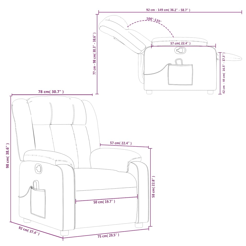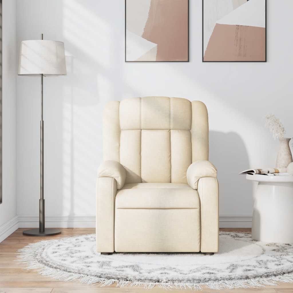 Lehne dich zurück und entspanne dich in diesem äußerst bequemen Massagesessel! Manuelle Liegefunktion: Dieser Ruhesessel lässt sich mittels des Griffs an der rechten Seite verstellen. So kannst du das Fußteil und die Rückenlehne manuell in jede beliebige Position bringen, um höchsten Komfort zu genießen. Die Rückenlehne lässt sich max. 135 Grad nach hinten verstellen. Durch einfaches Ziehen lässt sie sich schnell wieder in die ursprüngliche Position bringen.Vibrationsfunktion: Mit den 6 Massagepunkten kann man eine gezielte Massage genießen. Außerdem ermöglicht die mitgelieferte Handsteuerung die Auswahl verschiedener Massageprogramme. Die Massagefunktion wird über den USB-Anschluss mit Strom betrieben, aber das zugelassene 5V-USB-Netzteil ist nicht im Lieferumfang enthalten.Bequemes Sitzerlebnis: Die dick gepolsterte Sitzfläche, die Rückenlehne und die breiten Armlehnen sorgen für ein behagliches und wohliges Sitzgefühl. Der Bezug aus Stoff weist eine schlichte und saubere Optik auf und ist auch atmungsaktiv und langlebig.Praktische Seitentasche: Dieser Sessel verfügt über eine Seitentasche, in der du deine Fernbedienung oder andere wichtige Sachen griffbereit aufbewahren kannst.Solider und stabiler Rahmen: Der Rahmen aus Holz und Metall sorgt für eine solide Struktur und hohe Stabilität. Dieser TV-Sessel ist bequem und langlebig.