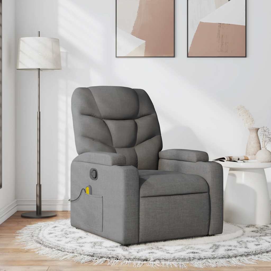Lehne dich zurück und entspanne dich in diesem äußerst bequemen Massagesessel! Manuelle Liegefunktion: Dieser Ruhesessel lässt sich mittels des seitlichen Griffs verstellen. So kannst du das Fußteil und die Rückenlehne manuell in jede beliebige Position bringen, um die komfortabelste Position zu genießen. Die Rückenlehne lässt sich max. 135 Grad nach hinten verstellen. Durch einfaches Ziehen am Griff wird sie schnell in die ursprüngliche Position zurückgestellt.Vibrationsfunktion: Mit den 6 Massagepunkten kann man eine gezielte Massage genießen. Außerdem ermöglicht die mitgelieferte Handsteuerung die Auswahl verschiedener Massageprogramme. Die Massagefunktion wird über den USB-Anschluss mit Strom betrieben, aber das zugelassene 5V-USB-Netzteil ist nicht im Lieferumfang enthalten.Bequemes Sitzerlebnis: Die dick gepolsterte Sitzfläche, die Rückenlehne und die breiten Armlehnen sorgen für ein behagliches und wohliges Sitzgefühl. Der Bezug aus Stoff weist eine schlichte und saubere Optik auf und ist auch atmungsaktiv und langlebig.Praktische Getränkehalter und Seitentasche: Dieser Sessel verfügt über zwei praktische Getränkehalter und eine Seitentasche, in der du deine Fernbedienung oder andere wichtige Sachen griffbereit aufbewahren kannst.Solider und stabiler Rahmen: Der Rahmen aus Holz und Metall sorgt für eine solide Struktur und hohe Stabilität. Dieser TV-Sessel ist bequem und langlebig.