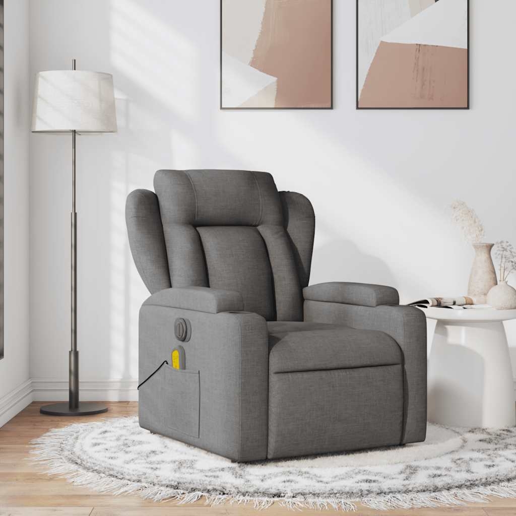 Lehne dich zurück und entspanne dich in diesem äußerst bequemen Massagesessel! Manuelle Liegefunktion: Dieser Ruhesessel lässt sich mittels des seitlichen Griffs verstellen. So kannst du das Fußteil und die Rückenlehne manuell in jede beliebige Position bringen, um die komfortabelste Position zu genießen. Die Rückenlehne lässt sich max. 135 Grad nach hinten verstellen. Durch einfaches Ziehen am Griff wird sie schnell in die ursprüngliche Position zurückgestellt.Vibrationsfunktion: Mit den 6 Massagepunkten kann man eine gezielte Massage genießen. Außerdem ermöglicht die mitgelieferte Handsteuerung die Auswahl verschiedener Massageprogramme. Die Massagefunktion wird über den USB-Anschluss mit Strom betrieben, aber das zugelassene 5V-USB-Netzteil ist nicht im Lieferumfang enthalten.Bequemes Sitzerlebnis: Die dick gepolsterte Sitzfläche, die Rückenlehne und die breiten Armlehnen sorgen für ein behagliches und wohliges Sitzgefühl. Der Bezug aus Stoff weist eine schlichte und saubere Optik auf und ist auch atmungsaktiv und langlebig.Praktische Getränkehalter und Seitentasche: Dieser Sessel verfügt über zwei praktische Getränkehalter und eine Seitentasche, in der du deine Fernbedienung oder andere wichtige Sachen griffbereit aufbewahren kannst.Solider und stabiler Rahmen: Der Rahmen aus Holz und Metall sorgt für eine solide Struktur und hohe Stabilität. Dieser TV-Sessel ist bequem und langlebig.