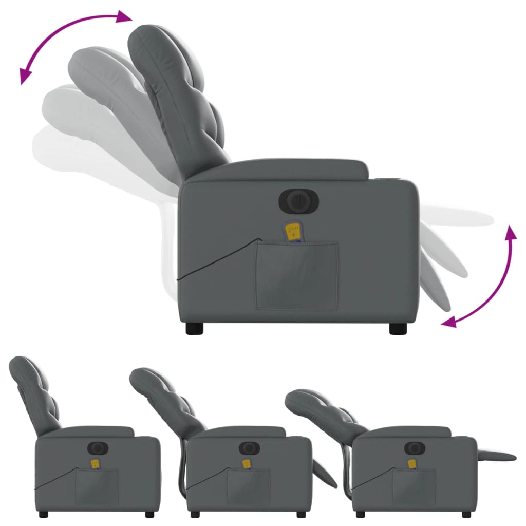 Lehne dich zurück und entspanne dich in diesem äußerst bequemen Massagesessel! Elektrische Liegefunktion: Dieser Relaxsessel ist mit einem Elektromotor ausgestattet, der Fußstütze und Rückenlehne durch einfaches Drücken des seitlichen Knopfes automatisch in jede gewünschte Position bringt. Diese Funktion ermöglicht eine maximale Neigung von 135 Grad. Darüber hinaus lässt sich die Rückenlehne auf Knopfdruck automatisch in die ursprünglichen Position zurückbringen.Vibrationsfunktion: Dank der 6 Massagepunkte genießt du eine gezielte Massage. Zudem lassen sich verschiedene Massageprogramme über die mitgelieferte Handsteuerung auswählen. Die Massagefunktion wird über den USB-Anschluss betrieben, der eine zertifizierte 5-V-USB-Stromquelle erfordert (nicht im Lieferumfang enthalten).Bequemes Sitzerlebnis: Die dick gepolsterte Sitzfläche, die Rückenlehne und die breiten, mit Kunstleder bezogenen Armlehnen sorgen für ein behagliches und angenehmes Sitzgefühl. Kunstleder ist ein äußerst langlebiges Material. Es ist schmutzabweisend und lässt sich mit einem feuchten Tuch einfach reinigen. Durch die glatte Oberfläche weist es die luxuriöse Schönheit von Echtleder auf.Praktische Getränkehalter und Seitentasche: Dieser Sessel verfügt über zwei praktische Becherhalter und eine Seitentasche, in der du wichtige Sachen griffbereit aufbewahren kannst.Solider und stabiler Rahmen: Der Rahmen aus Holz und Metall sorgt für eine solide Struktur und hohe Stabilität. Dieser TV-Sessel ist bequem und langlebig.
