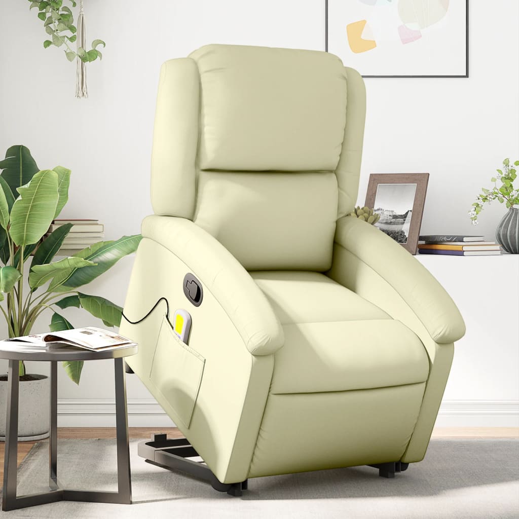 Lehne dich zurück und entspanne dich in diesem äußerst bequemen Massagesessel mit Aufstehhilfe! Elektrische Aufstehhilfe: Dieser Relaxsessel ist mit einem Elektromotor zum Anheben ausgestattet. Dank der Aufstehhilfe, die den gesamten Sessel nach oben bringt, kannst du ganz einfach auf Knopfdruck aufstehen, ohne deinen Rücken und deine Knie zu belasten.Manuelle Liegefunktion: Dieser Ruhesessel lässt sich mittels des Griffs an der rechten Seite verstellen. So kannst du das Fußteil und die Rückenlehne manuell in jede beliebige Position bringen, um höchsten Komfort zu genießen. Die Rückenlehne lässt sich max. 135 Grad nach hinten verstellen. Durch einfaches Ziehen lässt sie sich schnell wieder in die ursprüngliche Position bringen.Vibrationsfunktion: Dank der 6 Massagepunkte genießt du eine gezielte Massage. Zudem lassen sich verschiedene Massageprogramme über die mitgelieferte Handsteuerung auswählen. Die Massagefunktion wird über den USB-Anschluss betrieben, der eine zertifizierte 5-V-USB-Stromquelle erfordert (nicht im Lieferumfang enthalten).Bequemes Sitzerlebnis: Der dick gepolsterte Sitz, die Rückenlehne und die breiten, mit Echtleder bezogenen Armlehnen sorgen für ein behagliches und angenehmes Sitzgefühl. Echtes Leder ist ein natürliches, zeitloses Material. Bei richtiger Pflege kann es ein Leben lang halten. Die glatte Oberfläche verleiht ihm außerdem ein stilvolles Aussehen und sorgt für hohen Komfort. Praktische Seitentasche: Dieser Sessel verfügt über eine Seitentasche, in der du deine Fernbedienung oder andere wichtige Sachen griffbereit aufbewahren kannst.Solider und stabiler Rahmen: Der Rahmen aus Holz und Metall sorgt für eine solide Struktur und hohe Stabilität. Dieser TV-Sessel ist bequem und langlebig.