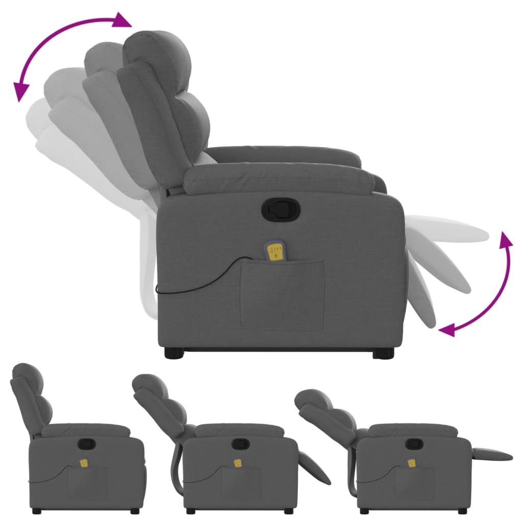 Lehne dich zurück und entspanne dich in diesem äußerst bequemen Massagesessel mit Aufstehhilfe! Elektrische Aufstehhilfe: Dieser Relaxsessel ist mit einem Elektromotor zum Anheben ausgestattet. Dank der Aufstehhilfe, die den gesamten Sessel nach oben bringt, kannst du ganz einfach auf Knopfdruck aufstehen, ohne deinen Rücken und deine Knie zu belasten.Manuelle Liegefunktion: Dieser Ruhesessel lässt sich mittels des Griffs an der rechten Seite verstellen. So kannst du das Fußteil und die Rückenlehne manuell in jede beliebige Position bringen, um höchsten Komfort zu genießen. Die Rückenlehne lässt sich max. 135 Grad nach hinten verstellen. Durch einfaches Ziehen lässt sie sich schnell wieder in die ursprüngliche Position bringen.Vibrationsfunktion: Dank der 6 Massagepunkte genießt du eine gezielte Massage. Zudem lassen sich verschiedene Massageprogramme über die mitgelieferte Handsteuerung auswählen. Die Massagefunktion wird über den USB-Anschluss betrieben, der eine zertifizierte 5-V-USB-Stromquelle erfordert (nicht im Lieferumfang enthalten).Bequemes Sitzerlebnis: Die dick gepolsterte Sitzfläche, die Rückenlehne und die breiten Armlehnen sorgen für ein behagliches und wohliges Sitzgefühl. Der Bezug aus Stoff weist eine schlichte und saubere Optik auf und ist auch atmungsaktiv und langlebig.Praktische Seitentasche: Dieser Sessel verfügt über eine Seitentasche, in der du deine Fernbedienung oder andere wichtige Sachen griffbereit aufbewahren kannst.Solider und stabiler Rahmen: Der Rahmen aus Holz und Metall sorgt für eine solide Struktur und hohe Stabilität. Dieser TV-Sessel ist bequem und langlebig.