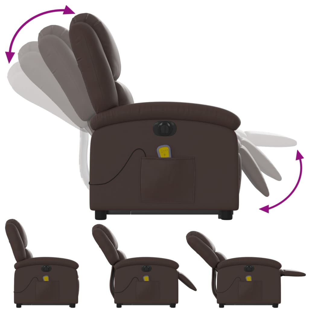 Lehne dich zurück und entspanne dich in diesem äußerst bequemen elektrischen Massagesessel mit Aufstehhilfe! Elektrische Aufstehhilfe: Dieser Relaxsessel ist mit einem Elektromotor zum Anheben ausgestattet. Dank der Aufstehhilfe, die den gesamten Sessel nach oben bringt, kannst du ganz einfach auf Knopfdruck aufstehen, ohne deinen Rücken und deine Knie zu belasten.Elektrische Liegefunktion: Dieser Relaxsessel ist mit einem Elektromotor ausgestattet, der Fußstütze und Rückenlehne durch einfaches Drücken des seitlichen Knopfes automatisch in jede gewünschte Position bringt. Diese Funktion ermöglicht eine maximale Neigung von 135 Grad. Darüber hinaus lässt sich die Rückenlehne auf Knopfdruck automatisch in die ursprünglichen Position zurückbringen.Vibrationsfunktion: Dank der 6 Massagepunkte genießt du eine gezielte Massage. Zudem lassen sich verschiedene Massageprogramme über die mitgelieferte Handsteuerung auswählen. Die Massagefunktion wird über den USB-Anschluss betrieben, der eine zertifizierte 5-V-USB-Stromquelle erfordert (nicht im Lieferumfang enthalten).Bequemes Sitzerlebnis: Die dick gepolsterte Sitzfläche, die Rückenlehne und die breiten, mit Kunstleder bezogenen Armlehnen sorgen für ein behagliches und angenehmes Sitzgefühl. Kunstleder ist ein äußerst langlebiges Material. Es ist schmutzabweisend und lässt sich mit einem feuchten Tuch einfach reinigen. Durch die glatte Oberfläche weist es die luxuriöse Schönheit von Echtleder auf.Praktische Seitentasche: Dieser Sessel verfügt über eine Seitentasche, in der du deine Fernbedienung oder andere wichtige Sachen griffbereit aufbewahren kannst.Solider und stabiler Rahmen: Der Rahmen aus Holz und Metall sorgt für eine solide Struktur und hohe Stabilität. Dieser TV-Sessel ist bequem und langlebig.