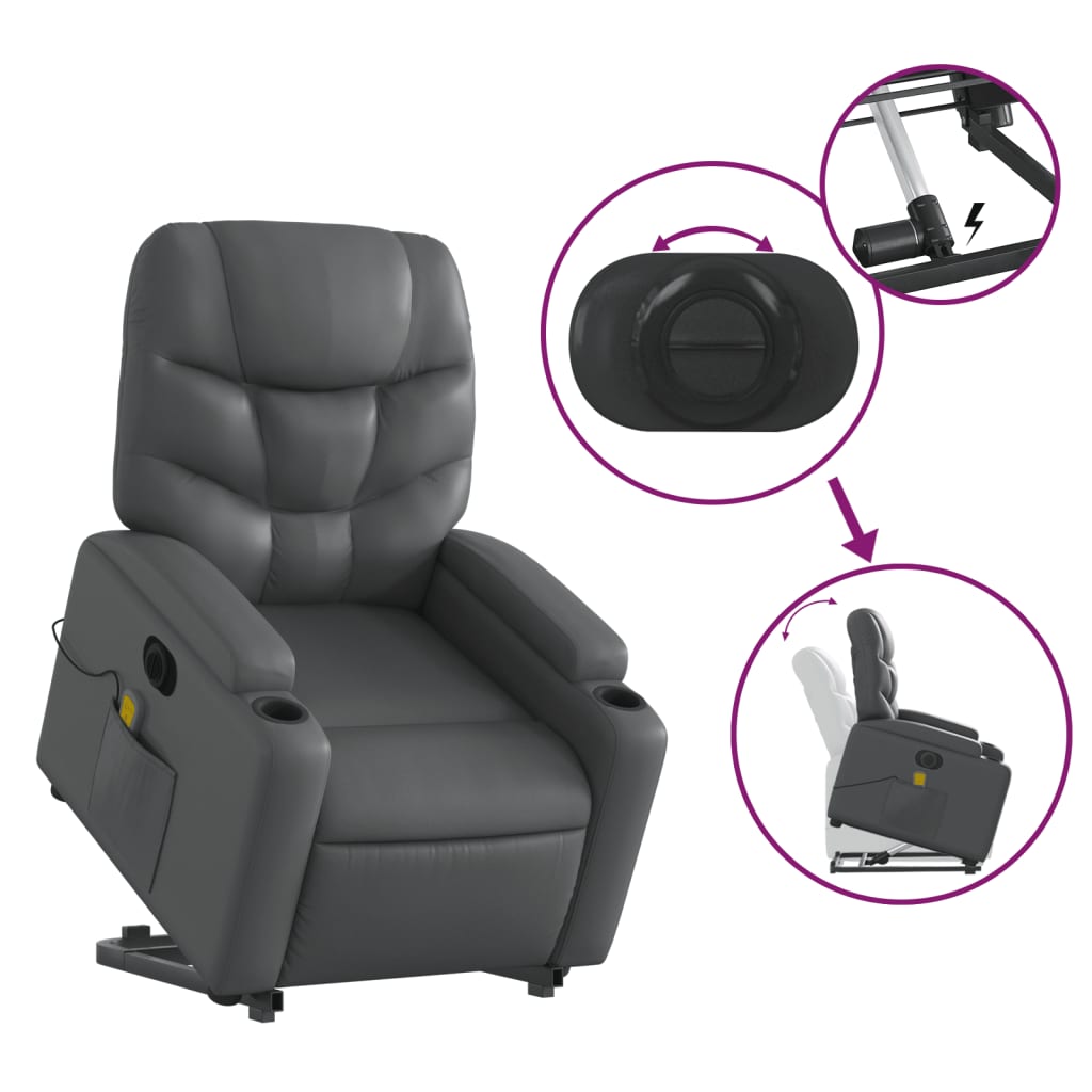 Lehne dich zurück und entspanne dich in diesem äußerst bequemen elektrischen Massagesessel mit Aufstehhilfe! Elektrische Aufstehhilfe: Dieser Relaxsessel ist mit einem Elektromotor zum Anheben ausgestattet. Dank der Aufstehhilfe, die den gesamten Sessel nach oben bringt, kannst du ganz einfach auf Knopfdruck aufstehen, ohne deinen Rücken und deine Knie zu belasten.Elektrische Liegefunktion: Dieser Relaxsessel ist mit einem Elektromotor ausgestattet, der Fußstütze und Rückenlehne durch einfaches Drücken des seitlichen Knopfes automatisch in jede gewünschte Position bringt. Diese Funktion ermöglicht eine maximale Neigung von 135 Grad. Darüber hinaus lässt sich die Rückenlehne auf Knopfdruck automatisch in die ursprünglichen Position zurückbringen.Vibrationsfunktion: Dank der 6 Massagepunkte genießt du eine gezielte Massage. Zudem lassen sich verschiedene Massageprogramme über die mitgelieferte Handsteuerung auswählen. Die Massagefunktion wird über den USB-Anschluss betrieben, der eine zertifizierte 5-V-USB-Stromquelle erfordert (nicht im Lieferumfang enthalten).Bequemes Sitzerlebnis: Die dick gepolsterte Sitzfläche, die Rückenlehne und die breiten, mit Kunstleder bezogenen Armlehnen sorgen für ein behagliches und angenehmes Sitzgefühl. Kunstleder ist ein äußerst langlebiges Material. Es ist schmutzabweisend und lässt sich mit einem feuchten Tuch einfach reinigen. Durch die glatte Oberfläche weist es die luxuriöse Schönheit von Echtleder auf.Praktische Getränkehalter und Seitentasche: Dieser Sessel verfügt über zwei praktische Becherhalter und eine Seitentasche, in der du wichtige Sachen griffbereit aufbewahren kannst.Solider und stabiler Rahmen: Der Rahmen aus Holz und Metall sorgt für eine solide Struktur und hohe Stabilität. Dieser TV-Sessel ist bequem und langlebig.