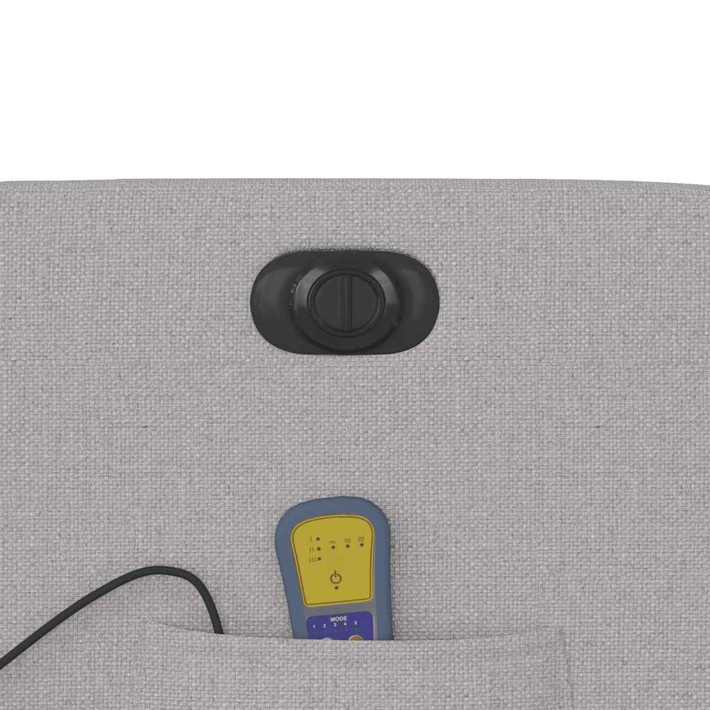 Lehne dich zurück und entspanne dich in diesem äußerst bequemen elektrischen Massagesessel mit Aufstehhilfe! Elektrische Aufstehhilfe: Dieser Relaxsessel ist mit einem Elektromotor zum Anheben ausgestattet. Dank der Aufstehhilfe, die den gesamten Sessel nach oben bringt, kannst du ganz einfach auf Knopfdruck aufstehen, ohne deinen Rücken und deine Knie zu belasten.Elektrische Liegefunktion: Dieser Relaxsessel ist mit einem Elektromotor ausgestattet, der Fußstütze und Rückenlehne durch einfaches Drücken des seitlichen Knopfes automatisch in jede gewünschte Position bringt. Diese Funktion ermöglicht eine maximale Neigung von 135 Grad. Darüber hinaus lässt sich die Rückenlehne auf Knopfdruck automatisch in die ursprünglichen Position zurückbringen.Vibrationsfunktion: Dank der 6 Massagepunkte genießt du eine gezielte Massage. Zudem lassen sich verschiedene Massageprogramme über die mitgelieferte Handsteuerung auswählen. Die Massagefunktion wird über den USB-Anschluss betrieben, der eine zertifizierte 5-V-USB-Stromquelle erfordert (nicht im Lieferumfang enthalten).Bequemes Sitzerlebnis: Die dick gepolsterte Sitzfläche, die Rückenlehne und die breiten Armlehnen sorgen für ein behagliches und wohliges Sitzgefühl. Der Bezug aus Stoff weist eine schlichte und saubere Optik auf und ist auch atmungsaktiv und langlebig.Praktische Seitentasche: Dieser Sessel verfügt über eine Seitentasche, in der du deine Fernbedienung oder andere wichtige Sachen griffbereit aufbewahren kannst.Solider und stabiler Rahmen: Der Rahmen aus Holz und Metall sorgt für eine solide Struktur und hohe Stabilität. Dieser TV-Sessel ist bequem und langlebig.