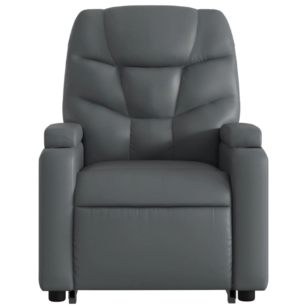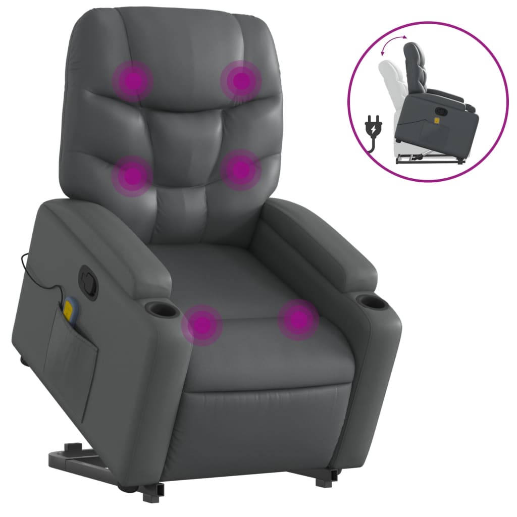 Lehne dich zurück und entspanne dich in diesem äußerst bequemen Massagesessel mit Aufstehhilfe! Elektrische Aufstehhilfe: Dieser Relaxsessel ist mit einem Elektromotor zum Anheben ausgestattet. Dank der Aufstehhilfe, die den gesamten Sessel nach oben bringt, kannst du ganz einfach auf Knopfdruck aufstehen, ohne deinen Rücken und deine Knie zu belasten.Manuelle Liegefunktion: Dieser Ruhesessel lässt sich mittels des Griffs an der rechten Seite verstellen. So kannst du das Fußteil und die Rückenlehne manuell in jede beliebige Position bringen, um höchsten Komfort zu genießen. Die Rückenlehne lässt sich max. 135 Grad nach hinten verstellen. Durch einfaches Ziehen lässt sie sich schnell wieder in die ursprüngliche Position bringen.Vibrationsfunktion: Dank der 6 Massagepunkte genießt du eine gezielte Massage. Zudem lassen sich verschiedene Massageprogramme über die mitgelieferte Handsteuerung auswählen. Die Massagefunktion wird über den USB-Anschluss betrieben, der eine zertifizierte 5-V-USB-Stromquelle erfordert (nicht im Lieferumfang enthalten).Bequemes Sitzerlebnis: Die dick gepolsterte Sitzfläche, die Rückenlehne und die breiten, mit Kunstleder bezogenen Armlehnen sorgen für ein behagliches und angenehmes Sitzgefühl. Kunstleder ist ein äußerst langlebiges Material. Es ist schmutzabweisend und lässt sich mit einem feuchten Tuch einfach reinigen. Durch die glatte Oberfläche weist es die luxuriöse Schönheit von Echtleder auf.Praktische Getränkehalter und Seitentasche: Dieser Sessel verfügt über zwei praktische Becherhalter und eine Seitentasche, in der du wichtige Sachen griffbereit aufbewahren kannst.Solider und stabiler Rahmen: Der Rahmen aus Holz und Metall sorgt für eine solide Struktur und hohe Stabilität. Dieser TV-Sessel ist bequem und langlebig.