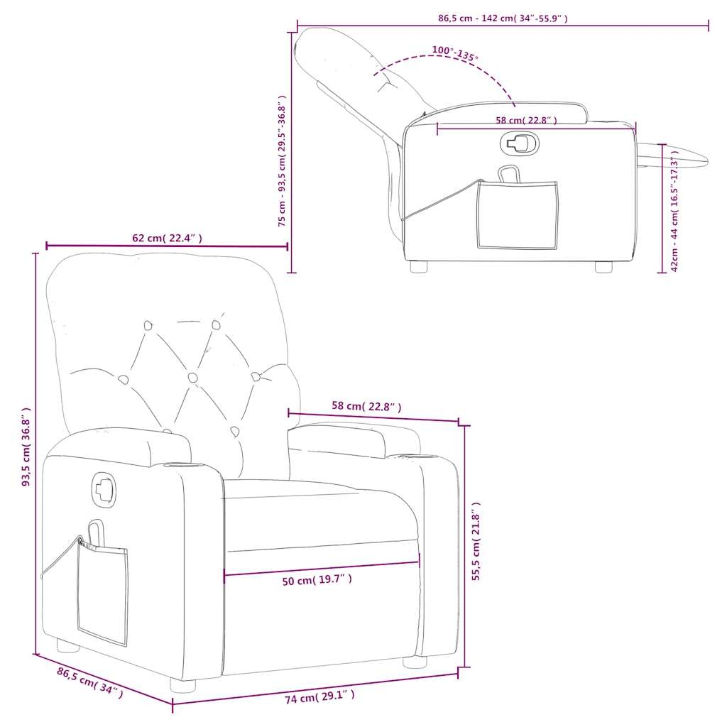 Lehne dich zurück und entspanne dich in diesem äußerst bequemen Massagesessel! Manuelle Liegefunktion: Dieser Ruhesessel lässt sich mittels des seitlichen Griffs verstellen. So kannst du das Fußteil und die Rückenlehne manuell in jede beliebige Position bringen, um die komfortabelste Position zu genießen. Die Rückenlehne lässt sich max. 135 Grad nach hinten verstellen. Durch einfaches Ziehen am Griff wird sie schnell in die ursprüngliche Position zurückgestellt.Vibrationsfunktion: Mit den 6 Massagepunkten kann man eine gezielte Massage genießen. Außerdem ermöglicht die mitgelieferte Handsteuerung die Auswahl verschiedener Massageprogramme. Die Massagefunktion wird über den USB-Anschluss mit Strom betrieben, aber das zugelassene 5V-USB-Netzteil ist nicht im Lieferumfang enthalten.Bequemes Sitzerlebnis: Die dick gepolsterte Sitzfläche, die Rückenlehne und die breiten, mit Kunstleder bezogenen Armlehnen sorgen für ein behagliches und angenehmes Sitzgefühl. Kunstleder ist ein äußerst langlebiges Material. Es ist schmutzabweisend und lässt sich mit einem feuchten Tuch einfach reinigen. Durch die glatte Oberfläche weist es die luxuriöse Schönheit von Echtleder auf.Praktische Getränkehalter und Seitentasche: Dieser Sessel verfügt über zwei praktische Getränkehalter und eine Seitentasche, in der du deine Fernbedienung oder andere wichtige Sachen griffbereit aufbewahren kannst.Solider und stabiler Rahmen: Der Rahmen aus Holz und Metall sorgt für eine solide Struktur und hohe Stabilität. Dieser TV-Sessel ist bequem und langlebig.