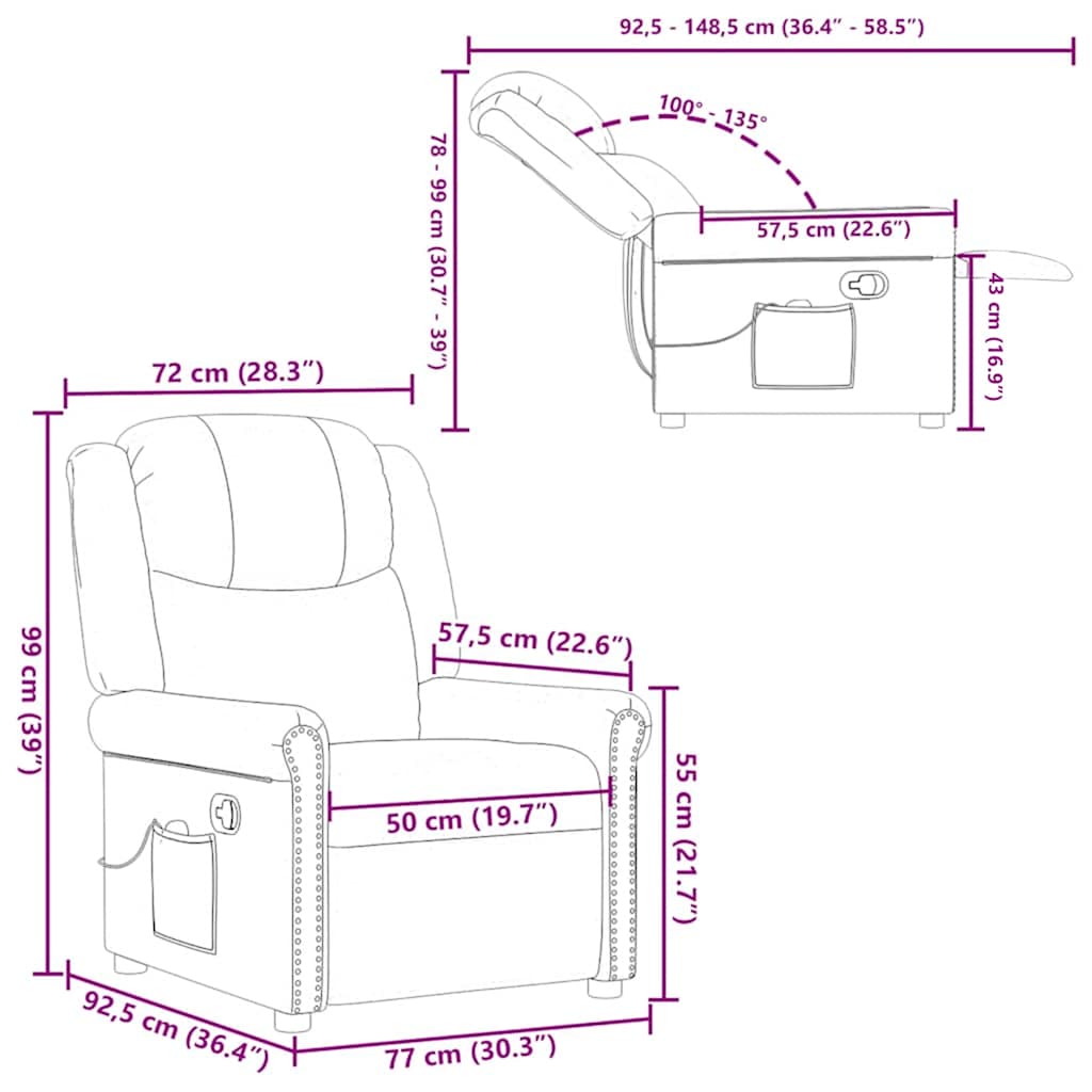 Lehne dich zurück und entspanne dich in diesem äußerst bequemen Massagesessel! Manuelle Liegefunktion: Dieser Ruhesessel lässt sich mittels des Griffs an der rechten Seite verstellen. So kannst du das Fußteil und die Rückenlehne manuell in jede beliebige Position bringen, um höchsten Komfort zu genießen. Die Rückenlehne lässt sich max. 135 Grad nach hinten verstellen. Durch einfaches Ziehen lässt sie sich schnell wieder in die ursprüngliche Position bringen.Vibrationsfunktion: Mit den 6 Massagepunkten kann man eine gezielte Massage genießen. Außerdem ermöglicht die mitgelieferte Handsteuerung die Auswahl verschiedener Massageprogramme. Die Massagefunktion wird über den USB-Anschluss mit Strom betrieben, aber das zugelassene 5V-USB-Netzteil ist nicht im Lieferumfang enthalten.Bequemes Sitzerlebnis: Der dick gepolsterte Sitz, die Rückenlehne und die breiten, mit Kunstleder bezogenen Armlehnen sorgen für ein behagliches und angenehmes Sitzgefühl. Künstliches Leder ist ein äußerst langlebiges Material. Es ist schmutzabweisend und lässt sich mit einem feuchten Tuch einfach reinigen. Durch die glatte Oberfläche weist es die luxuriöse Schönheit von Echtleder auf.Praktische Seitentasche: Dieser Sessel verfügt über eine Seitentasche, in der du deine Fernbedienung oder andere wichtige Sachen griffbereit aufbewahren kannst.Solider und stabiler Rahmen: Der Rahmen aus Holz und Metall sorgt für eine solide Struktur und hohe Stabilität. Dieser TV-Sessel ist bequem und langlebig.