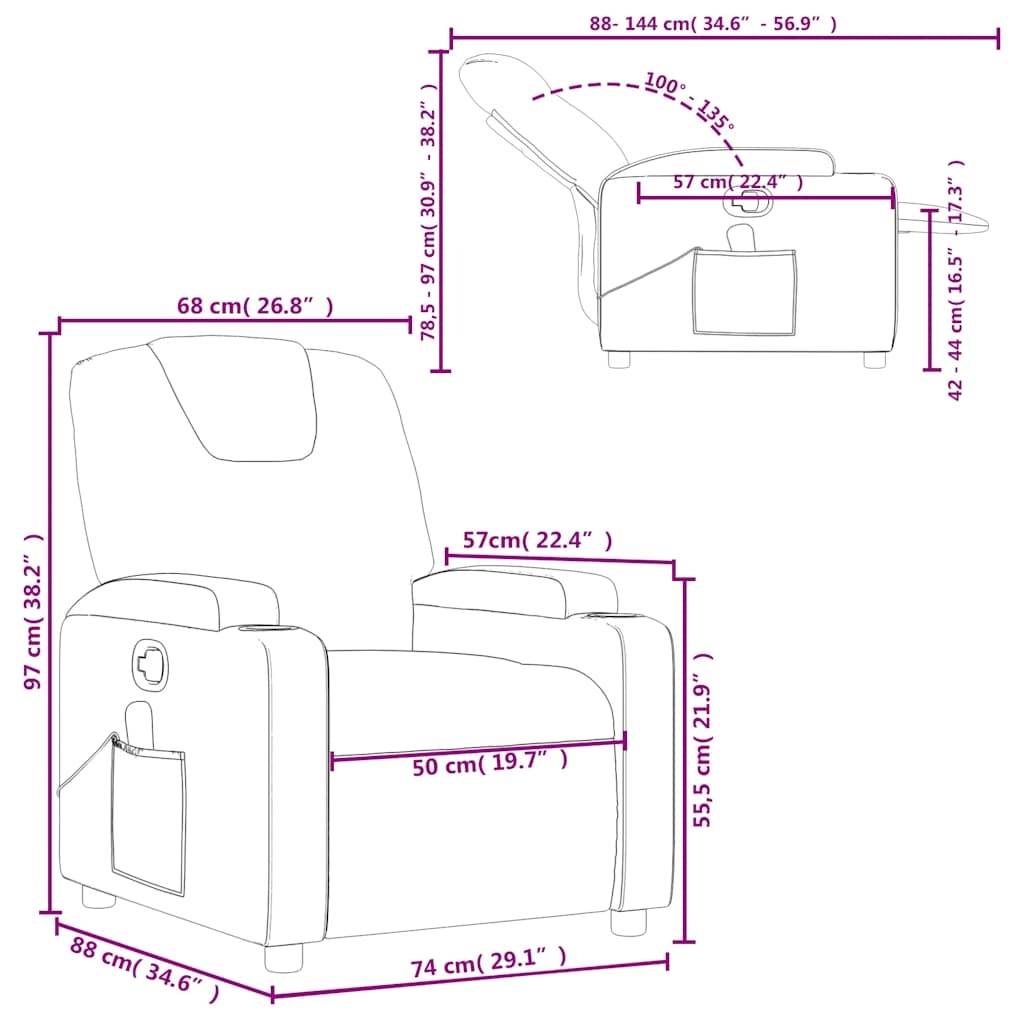 Lehne dich zurück und entspanne dich in diesem äußerst bequemen Massagesessel! Manuelle Liegefunktion: Dieser Ruhesessel lässt sich mittels des seitlichen Griffs verstellen. So kannst du das Fußteil und die Rückenlehne manuell in jede beliebige Position bringen, um die komfortabelste Position zu genießen. Die Rückenlehne lässt sich max. 135 Grad nach hinten verstellen. Durch einfaches Ziehen am Griff wird sie schnell in die ursprüngliche Position zurückgestellt.Vibrationsfunktion: Mit den 6 Massagepunkten kann man eine gezielte Massage genießen. Außerdem ermöglicht die mitgelieferte Handsteuerung die Auswahl verschiedener Massageprogramme. Die Massagefunktion wird über den USB-Anschluss mit Strom betrieben, aber das zugelassene 5V-USB-Netzteil ist nicht im Lieferumfang enthalten.Bequemes Sitzerlebnis: Die dick gepolsterte Sitzfläche, die Rückenlehne und die breiten, mit Kunstleder bezogenen Armlehnen sorgen für ein behagliches und angenehmes Sitzgefühl. Kunstleder ist ein äußerst langlebiges Material. Es ist schmutzabweisend und lässt sich mit einem feuchten Tuch einfach reinigen. Durch die glatte Oberfläche weist es die luxuriöse Schönheit von Echtleder auf.Praktische Getränkehalter und Seitentasche: Dieser Sessel verfügt über zwei praktische Getränkehalter und eine Seitentasche, in der du deine Fernbedienung oder andere wichtige Sachen griffbereit aufbewahren kannst.Solider und stabiler Rahmen: Der Rahmen aus Holz und Metall sorgt für eine solide Struktur und hohe Stabilität. Dieser TV-Sessel ist bequem und langlebig.
