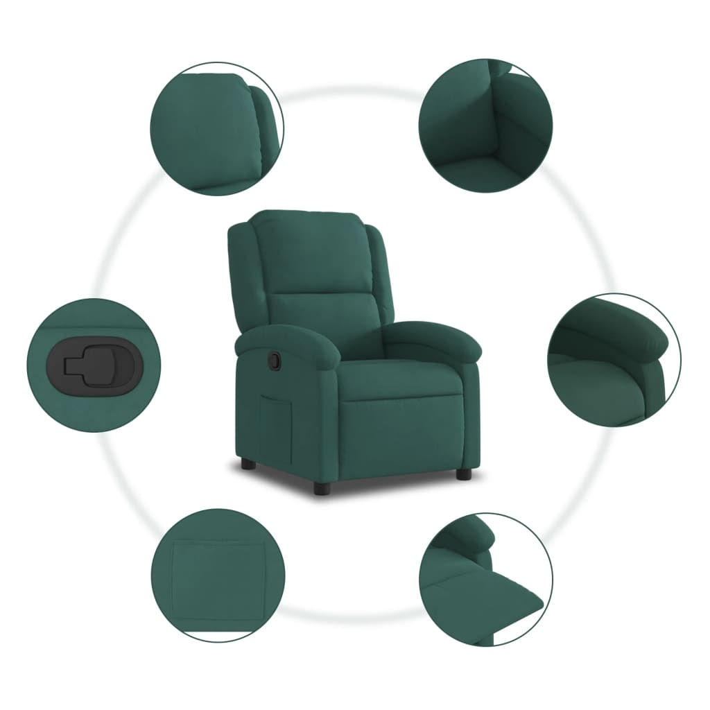 Lehne sich zurück und entspanne sich in diesem äußerst bequemen Relaxsessel! Manuelle Liegefunktion: Dieser Ruhesessel lässt sich mittels des seitlichen Griffs verstellen. So kannst du das Fußteil und die Rückenlehne manuell in jede beliebige Position bringen, um die komfortabelste Position zu genießen. Die Rückenlehne lässt sich max. 135 Grad nach hinten verstellen. Durch einfaches Ziehen am Griff wird sie schnell in die ursprüngliche Position zurückgestellt.Bequemes Sitzerlebnis: Der dick gepolsterte Sitz, die Rückenlehne und die breiten, mit Samt bezogenen Armlehnen sorgen für ein behagliches und warmes Gefühl, sodass du dich beim Sitzen wie umarmt fühlst. Samt ist ein weicher und bequemer Stoff, der sich angenehm auf der Haut anfühlt.Praktische Seitentasche: Dieser Sessel verfügt über eine Seitentasche, in der du wichtige Sachen griffbereit aufbewahren kannst.Solider und stabiler Rahmen: Der Rahmen aus Holz und Metall sorgt für eine solide Struktur und hohe Stabilität. Dieser TV-Sessel ist bequem und langlebig.