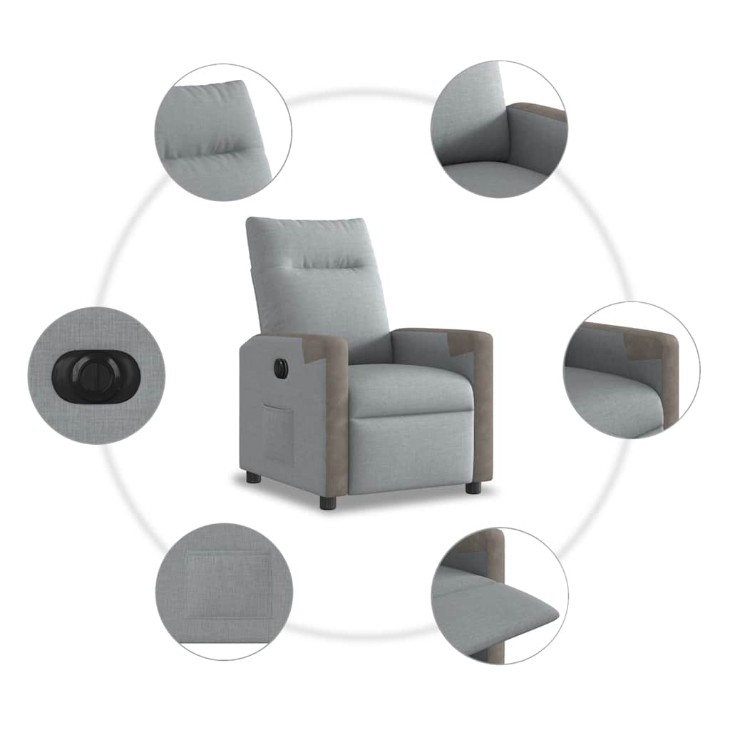 Lehne dich zurück und entspanne dich in diesem äußerst bequemen Fernsehsessel! Elektrische Liegefunktion: Dieser Relaxsessel ist mit einem Elektromotor ausgestattet, der Fußstütze und Rückenlehne durch einfaches Drücken des seitlichen Knopfes automatisch in jede gewünschte Position bringt. Diese Funktion ermöglicht eine maximale Neigung von 135 Grad. Darüber hinaus lässt sich die Rückenlehne auf Knopfdruck automatisch in die ursprünglichen Position zurückbringen.Bequemes Sitzerlebnis: Die dick gepolsterte Sitzfläche, die Rückenlehne und die breiten Armlehnen sorgen für ein behagliches und wohliges Sitzgefühl. Der Bezug aus Stoff weist eine schlichte und saubere Optik auf und ist auch atmungsaktiv und langlebig.Praktische Seitentasche: Dieser Sessel verfügt über eine Seitentasche, in der du wichtige Sachen griffbereit aufbewahren kannst.Solider und stabiler Rahmen: Der Rahmen aus Holz und Metall sorgt für eine solide Struktur und hohe Stabilität. Dieser TV-Sessel ist bequem und langlebig.