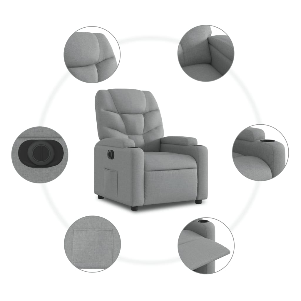 Lehne dich zurück und entspanne dich in diesem äußerst bequemen Fernsehsessel! Elektrische Liegefunktion: Dieser Relaxsessel ist mit einem Elektromotor ausgestattet, der Fußstütze und Rückenlehne durch einfaches Drücken des seitlichen Knopfes automatisch in jede gewünschte Position bringt. Diese Funktion ermöglicht eine maximale Neigung von 135 Grad. Darüber hinaus lässt sich die Rückenlehne auf Knopfdruck automatisch in die ursprünglichen Position zurückbringen.Bequemes Sitzerlebnis: Die dick gepolsterte Sitzfläche, die Rückenlehne und die breiten Armlehnen sorgen für ein behagliches und wohliges Sitzgefühl. Der Bezug aus Stoff weist eine schlichte und saubere Optik auf und ist auch atmungsaktiv und langlebig.Praktische Getränkehalter und Seitentasche: Dieser Sessel verfügt über zwei praktische Becherhalter und eine Seitentasche, in der du wichtige Sachen griffbereit aufbewahren kannst.Solider und stabiler Rahmen: Der Rahmen aus Holz und Metall sorgt für eine solide Struktur und hohe Stabilität. Dieser TV-Sessel ist bequem und langlebig.
