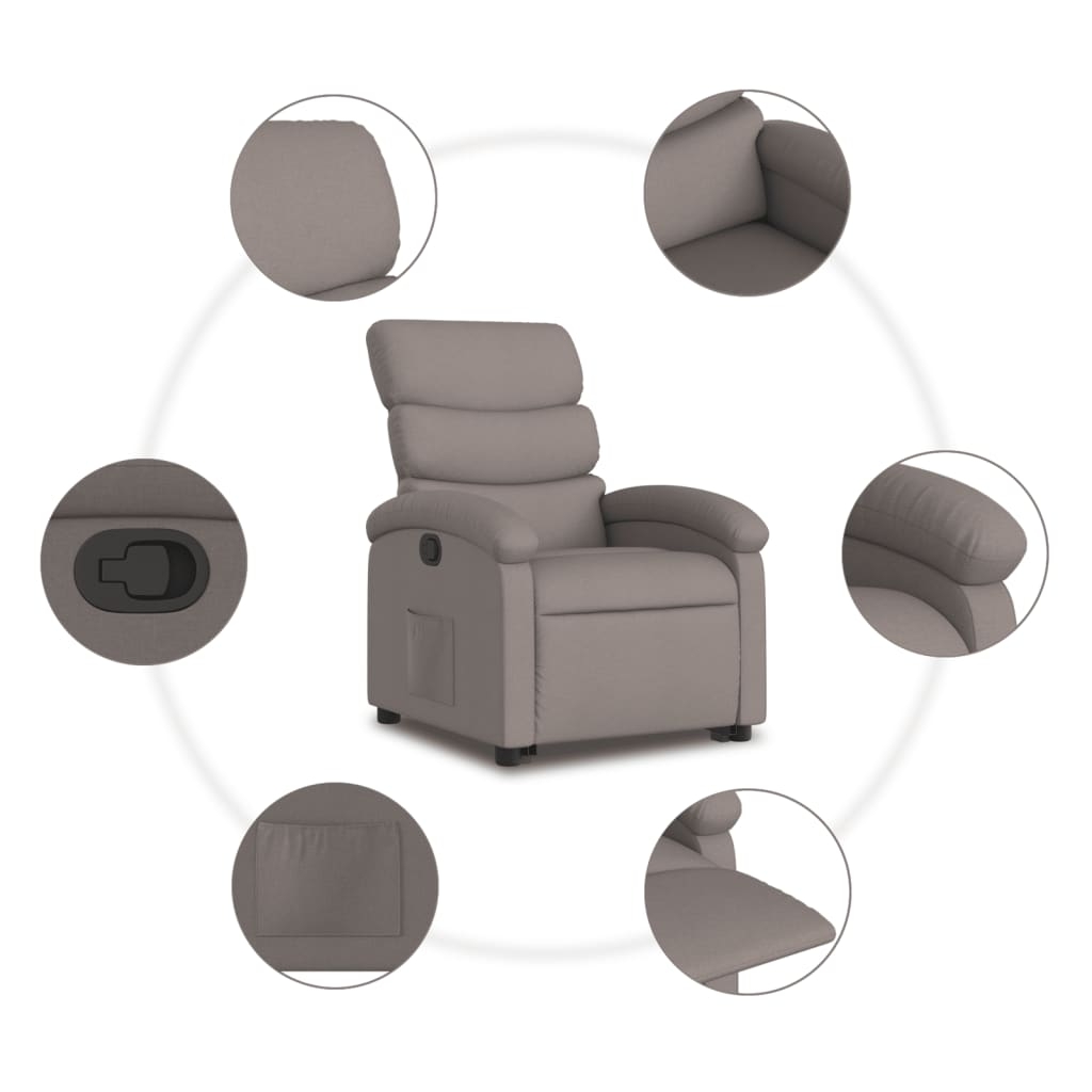 Lehne dich zurück und entspanne dich in diesem äußerst bequemen Relaxsessel mit Aufstehhilfe! Elektrische Aufstehhilfe: Dieser Relaxsessel ist mit einem Elektromotor zum Anheben ausgestattet. Dank der Aufstehhilfe, die den gesamten Sessel nach oben bringt, kannst du ganz einfach auf Knopfdruck aufstehen, ohne deinen Rücken und deine Knie zu belasten.Manuelle Liegefunktion: Dieser Ruhesessel lässt sich mittels des Griffs an der rechten Seite verstellen. So kannst du das Fußteil und die Rückenlehne manuell in jede beliebige Position bringen, um höchsten Komfort zu genießen. Die Rückenlehne lässt sich max. 135 Grad nach hinten verstellen. Durch einfaches Ziehen lässt sie sich schnell wieder in die ursprüngliche Position bringen.Bequemes Sitzerlebnis: Die dick gepolsterte Sitzfläche, die Rückenlehne und die breiten Armlehnen sorgen für ein behagliches und wohliges Sitzgefühl. Der Bezug aus Stoff weist eine schlichte und saubere Optik auf und ist auch atmungsaktiv und langlebig.Praktische Seitentasche: Dieser Sessel verfügt über eine Seitentasche, in der du wichtige Sachen griffbereit aufbewahren kannst.Solider und stabiler Rahmen: Der Rahmen aus Holz und Metall sorgt für eine solide Struktur und hohe Stabilität. Dieser TV-Sessel ist bequem und langlebig.