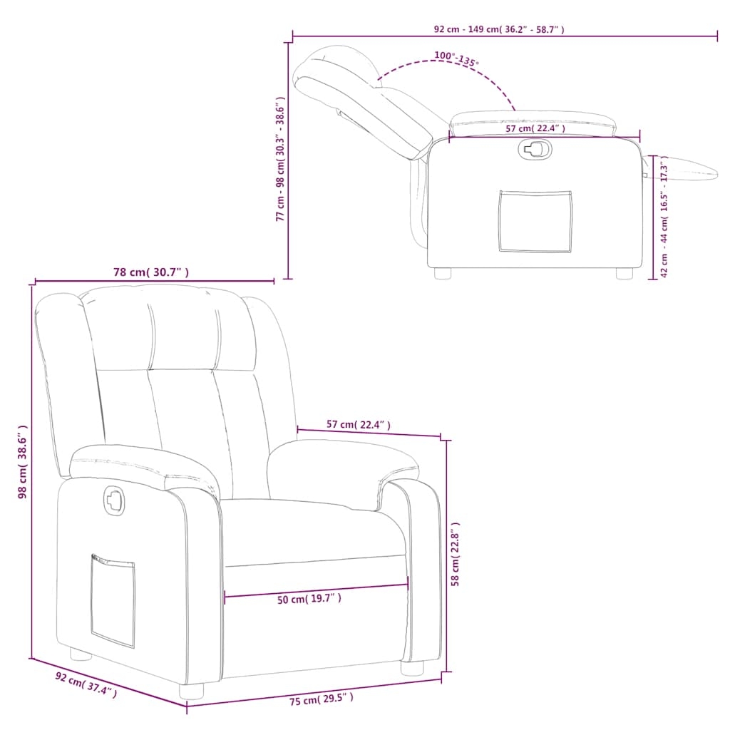 Lehne sich zurück und entspanne sich in diesem äußerst bequemen Relaxsessel! Manuelle Liegefunktion: Dieser Ruhesessel lässt sich mittels des Griffs an der rechten Seite verstellen. So kannst du das Fußteil und die Rückenlehne manuell in jede beliebige Position bringen, um höchsten Komfort zu genießen. Die Rückenlehne lässt sich max. 135 Grad nach hinten verstellen. Durch einfaches Ziehen lässt sie sich schnell wieder in die ursprüngliche Position bringen.Bequemes Sitzerlebnis: Die dick gepolsterte Sitzfläche, die Rückenlehne und die breiten, mit Kunstleder bezogenen Armlehnen sorgen für ein behagliches und angenehmes Sitzgefühl. Kunstleder ist ein äußerst langlebiges Material. Es ist schmutzabweisend und lässt sich mit einem feuchten Tuch einfach reinigen. Durch die glatte Oberfläche weist es die luxuriöse Schönheit von Echtleder auf.Praktische Seitentasche: Dieser Sessel verfügt über eine Seitentasche, in der du wichtige Sachen griffbereit aufbewahren kannst.Solider und stabiler Rahmen: Der Rahmen aus Holz und Metall sorgt für eine solide Struktur und hohe Stabilität. Dieser TV-Sessel ist bequem und langlebig.