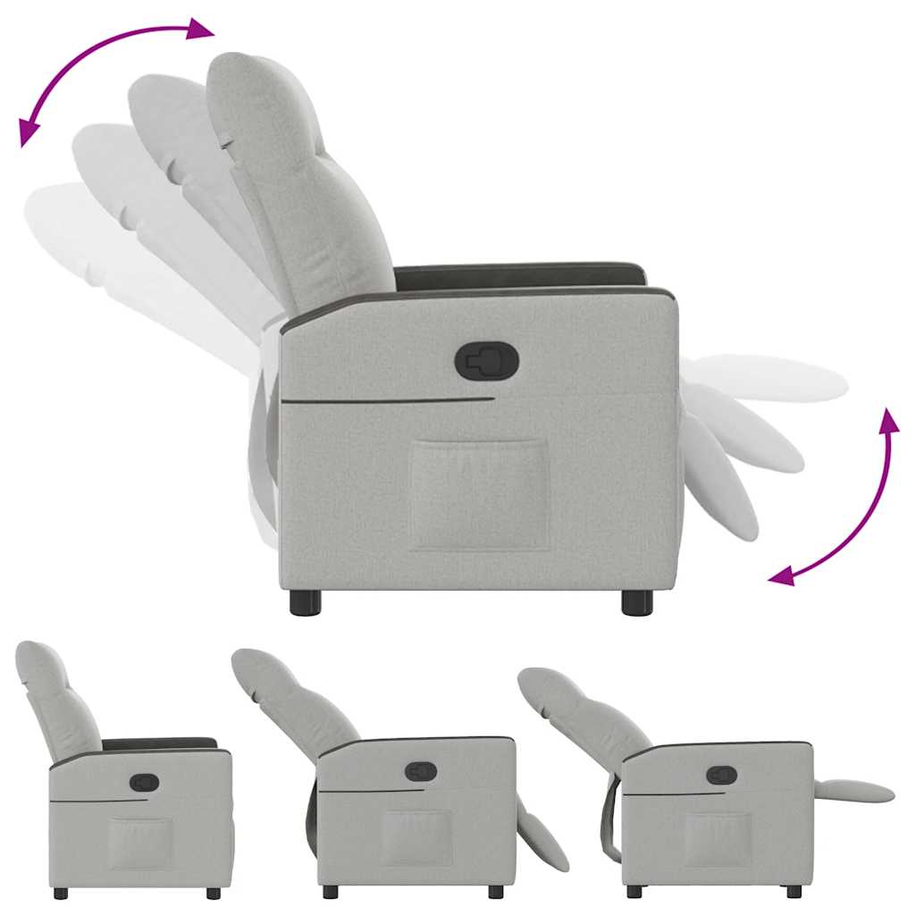 Lehne sich zurück und entspanne sich in diesem äußerst bequemen Relaxsessel! Manuelle Liegefunktion: Dieser Ruhesessel lässt sich mittels des Griffs an der rechten Seite verstellen. So kannst du das Fußteil und die Rückenlehne manuell in jede beliebige Position bringen, um höchsten Komfort zu genießen. Die Rückenlehne lässt sich max. 135 Grad nach hinten verstellen. Durch einfaches Ziehen lässt sie sich schnell wieder in die ursprüngliche Position bringen.Bequemes Sitzerlebnis: Die dick gepolsterte Sitzfläche, die Rückenlehne und die breiten Armlehnen sorgen für ein behagliches und wohliges Sitzgefühl. Der Bezug aus Stoff weist eine schlichte und saubere Optik auf und ist auch atmungsaktiv und langlebig.Praktische Seitentasche: Dieser Sessel verfügt über eine Seitentasche, in der du deine Fernbedienung oder andere wichtige Sachen griffbereit aufbewahren kannst.Solider und stabiler Rahmen: Der Rahmen aus Holz und Metall sorgt für eine solide Struktur und hohe Stabilität. Dieser TV-Sessel ist bequem und langlebig.