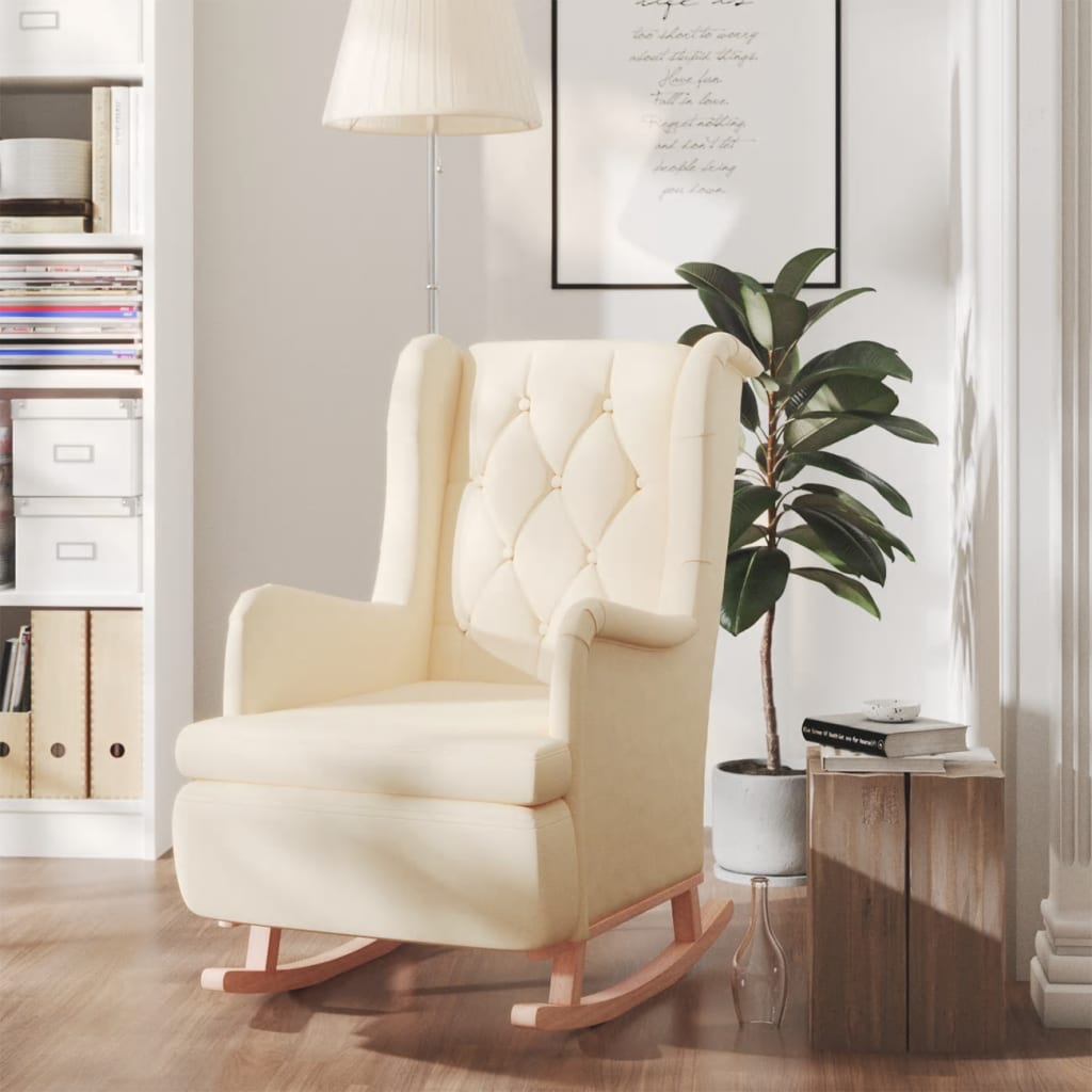 Der Sessel stellt eine großartige Kombination aus stilvollem Design und Zweckmäßigkeit dar. Die Mischung aus hochwertiger Handwerkskunst und Materialien macht diesen maßgefertigten Sessel zu einem unverzichtbaren Möbelstück für Ihre Einrichtung. Mit Zierknöpfen an der Rückenlehne versehen, ist der Sessel ästhetisch ansprechend gestaltet. Dank der bequemen Polsterung aus Schaumstoff und des weichen Stoffbezugs bietet er Ihnen optimalen Komfort in Ihrer Freizeit. Darüber hinaus wird dieser Esszimmerstuhl von Schaukelbeinen aus massivem Kautschukholz getragen, was zusätzliche Stabilität gewährleistet.