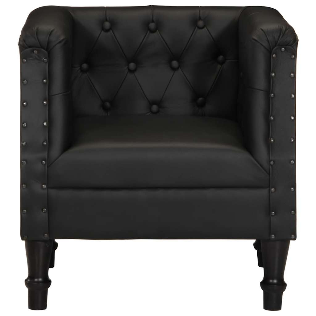 Was kann besser sein, als sich in einem komfortablen Armsessel am Ende eines Arbeitstages zu entspannen? Unser Echtleder-Loungesessel bietet Ihnen einen gemütlichen Rückzugsort am Ende eines langen Tages. Der Sessel ist mit echtem Ziegenleder bezogen, das sowohl weich als auch langlebig ist und einen Vintage-Charme ausstrahlt. Die Beine sind aus massivem Mangoholz gefertigt und tragen so zum Retro-Stil bei. Die Polsterung ist mit Nieten verziert und sorgt so für einen industriellen Look, den man fühlen kann. Dank den geschwungenen Armlehnen und der dicken Sitz- und der Rückpolsterung ist dieser Ledersessel der perfekte Platz zum Sitzen und Entspannen beim Fernsehen oder Musikhören. Dieser professionell handgefertigte Loungesessel mit klassischem Design ist ein echter Blickfänger in Ihrem Wohnzimmer, Schlafzimmer bzw. Gästezimmer.