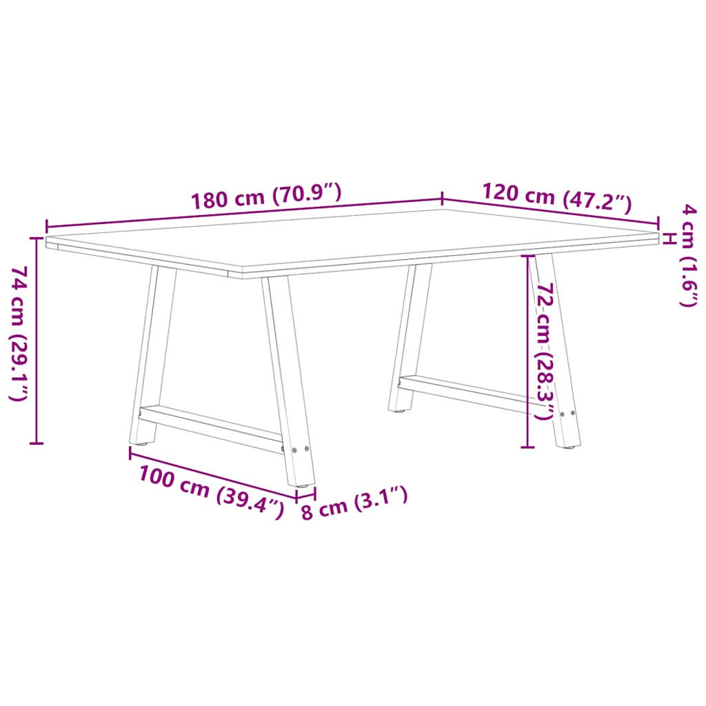 Mach jede Mahlzeit unvergesslich, indem du dich jeden Tag mit deiner Familie oder deinen Freunden um diesen Esstisch aus Holz versammelst! Robustes und langlebiges Material: Massives Eichenholz ist für seine Festigkeit, Haltbarkeit und schöne Maserung bekannt, weshalb es sich hervorragend für haltbare Möbel eignet. Durch seine natürliche Beständigkeit gegen Insektenbefall und Schimmelbildung sehen Eichenmöbel selbst nach jahrelangem Gebrauch brandneu aus.Großer Tisch: Dieser Tisch bietet mit seinen Maßen von 180 x 120 cm viel Platz zum Sitzen und ist das Herzstück deines Essbereichs.Einzigartiger Charme: Da Äste, Risse und Farbabweichungen natürliche Merkmale des Eichenholzes sind, hat jedes Stück dieses Produkts seinen ganz eigenen Charme. Auf den Bildern siehst du Beispiele für die zu erwartenden Variationen.Praktisches Design: Diese Esstischbeine sind mit verstellbaren Nivellierfüßen ausgestattet, die auch auf unebenen Böden für Stabilität sorgen und Bodenkratzer minimieren. Außerdem verfügt die Halterung über vorgebohrte Löcher und mitgelieferte Schrauben, mit denen das Bein an der Tischplatte befestigt werden kann, was die Montage erleichtert.Robustes und stabiles Gestell: Dieser Esszimmertisch hat A-förmige Beine aus pulverbeschichtetem Stahl, die für außergewöhnliche Stabilität und Sicherheit sorgen. Gut zu wissen:Jedes Stück ist ein Unikat, das in Farbe und Maserung variiert. Die Lieferung erfolgt in zufälliger Reihenfolge, wodurch die Exklusivität und Individualität deines Produkts gewährleistet wird.Äste und kleinere Fehler werden mit schwarzem Füllmaterial aufgefüllt, um eine schöne und glatte Tischoberfläche zu erhalten. Beispiele findest du in den Abbildungen.Die Tischplatte ist an den Rändern 4 cm dick, um ein robustes Aussehen zu gewährleisten, und in der Mitte 2 cm dick, um den Holzverbrauch und das Gesamtgewicht zu reduzieren.Bitte bohre die Löcher in der Mitte, nicht an den Rändern der Platte.Bitte achte darauf, die maximale Bohrtiefe von 15 mm nicht zu überschreiten, um die Tischplatte nicht zu beschädigen, da die Plattenstärke 20 mm beträgt.Wir empfehlen, einen Schraubendreher anstelle einer elektrischen Bohrmaschine zu verwenden, um Holzrisse beim Anbringen der Beine zu vermeiden.