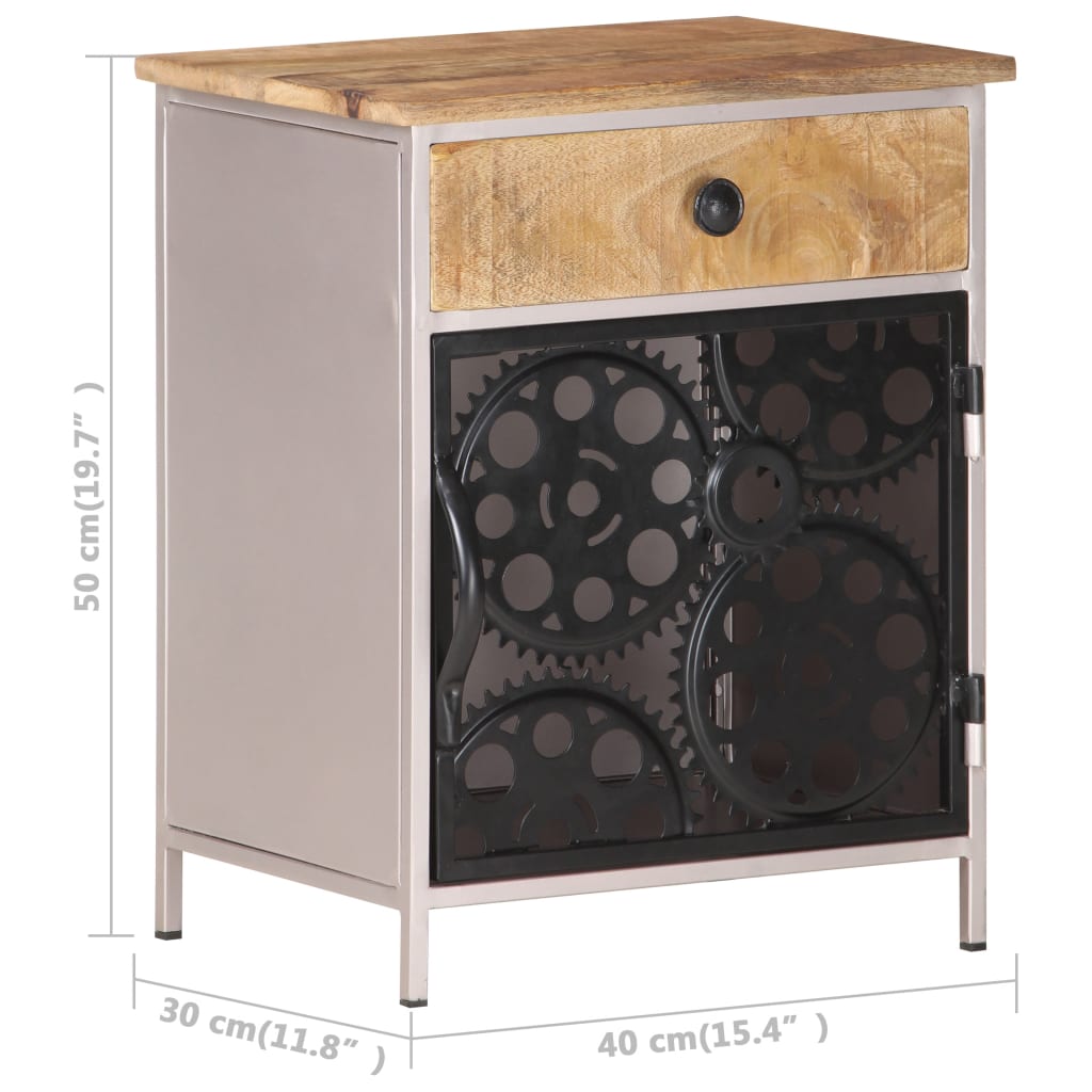 Dieser hölzerne Nachttisch ist speziell für Ihr Schlafzimmer konzipiert. Der Nachttisch besteht aus rauem Mangoholz, einem tropischen, belastbaren Hartholz. Es hält ebenfalls dem Verschleiß der Zeit stand, ist stabil und langlebig. Die Handwerkskunst und die schöne Holzmaserung machen jedes Möbelstück einzigartig, somit gleicht kein Schrank dem anderen. Dieser Nachttisch verfügt außerdem über eine Tür und eine Schublade und bietet ausreichend Stauraum, um Ihre wichtigen Sachen organisiert und in Reichweite zu halten. Darüber hinaus besteht die Tür aus echten Fahrradkettenrädern, wodurch das Möbelstück stylisch und einzigartig ist. Wichtiger Hinweis: Farbe und Maserung variieren von Stück zu Stück, so dass jedes Möbelstück einzigartig ist. Die Lieferung erfolgt nach dem Zufallsprinzip.