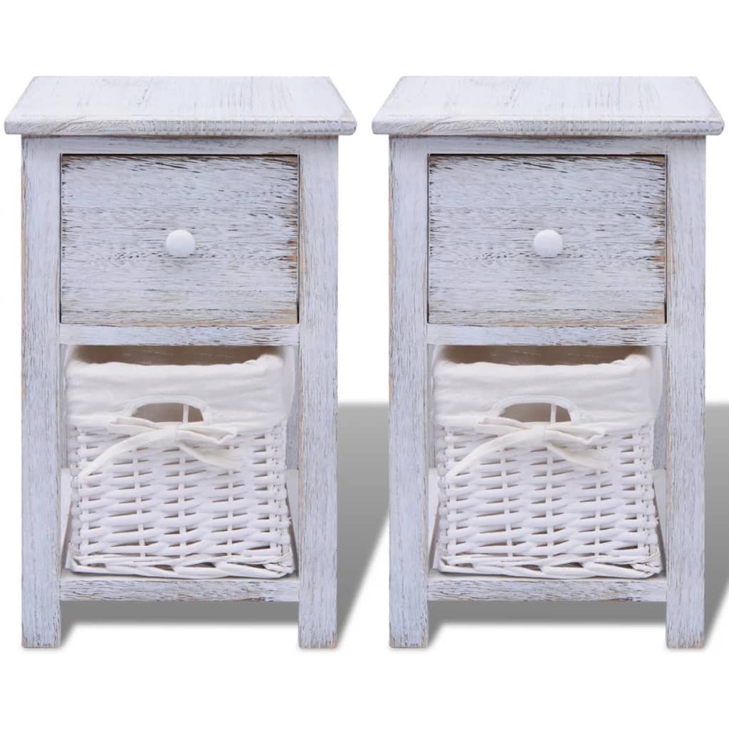 Verleihe deinem Zuhause eine rustikale Note mit diesen schicken Nachttischen aus Holz! Sie können auch als Telefontische, Beistelltische, Beistellschränke, Kommoden, Schubladenschränke, Ablagetische, Bettschränke usw. verwendet werden. Die kompakten Nachtschränke verfügen über leichtgängige Schubladen, die reichlich Platz bieten, um verschiedene Kleinigkeiten ordentlich und griffbereit aufzubewahren. Unter der Schublade befindet sich ein abnehmbarer Weidenkorb, der zusätzlichen Stauraum zur Verfügung stellt. Die Gewebeeinlagen der Körbe lassen sich abnehmen und waschen. Die Lieferung umfasst 2 Nachttische.