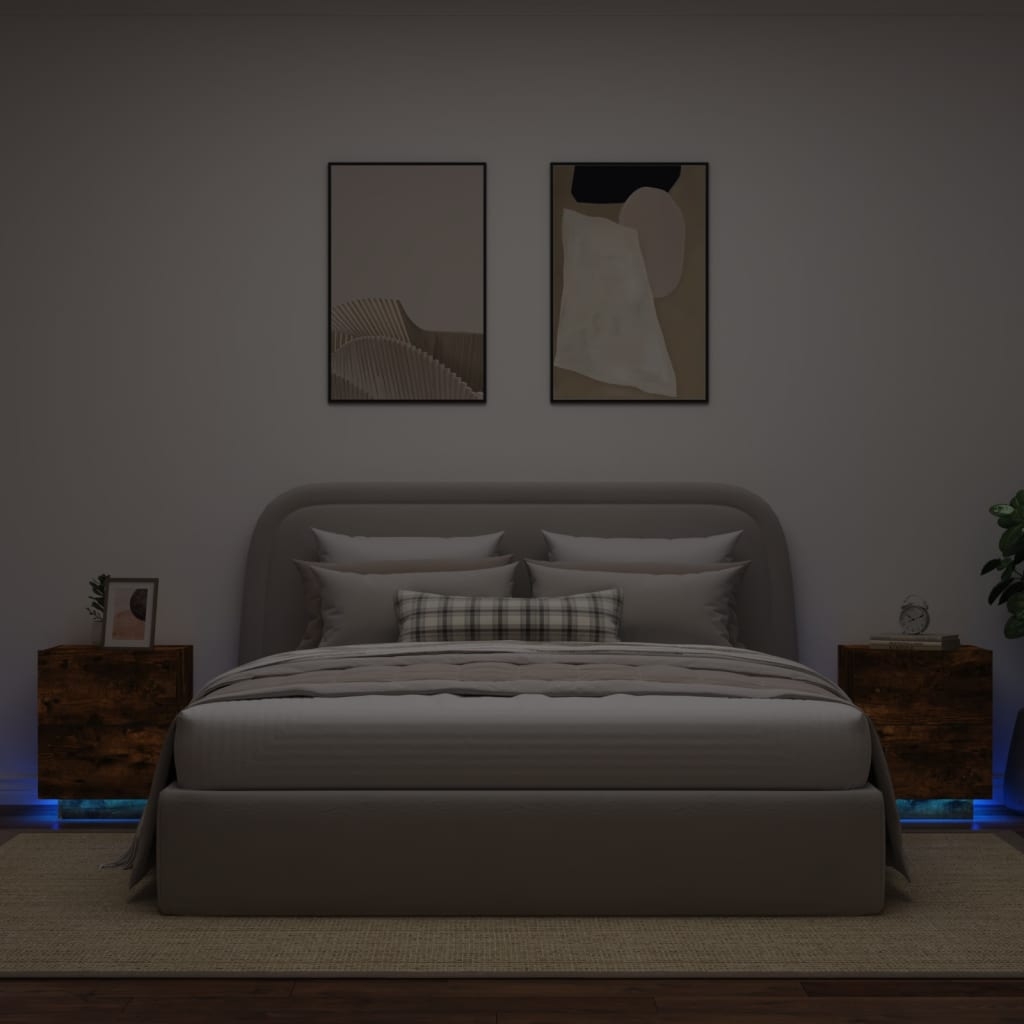 Diese Nachttische mit LED-Leuchten sind eine zeitlose Ergänzung zu deiner Inneneinrichtung. Langlebiges Material: Holzwerkstoff ist ein Material von außergewöhnlicher Qualität mit glatter Oberfläche, das sich durch Festigkeit, Stabilität und Feuchtigkeitsbeständigkeit auszeichnet.RGB-LED-Leuchten: Der Schrank ist mit lebendigen RGB-LED-Leuchten ausgestattet. Mit verschiedenen anpassbaren Menüs kannst du die Farbe der Lichter mühelos wechseln und sie sogar auf automatische Anpassung einstellen. Die LED-Beleuchtung unterstreicht den modernen Look des Nachttisches und trägt zu seinem trendigen Design bei.Reichlich Stauraum: Mit 2 Schubladen ausgestattet, bietet dieser Beistellschrank praktischen Stauraum, um deine Zeitschriften, Bücher, Fernbedienungen und andere Kleinigkeiten gut organisiert und in Reichweite aufzubewahren.Stabile Oberplatte: Die Oberplatte eignet sich perfekt, um Dekoartikel, Bilderrahmen und Topfpflanzen zur Schau zu stellen. Gut zu wissen:Das Produkt verfügt über einen USB-Anschluss, für den eine zertifizierte 5V-USB-Stromquelle erforderlich ist (nicht im Lieferumfang enthalten). Achtung:Um das Umkippen zu verhindern, muss dieses Produkt mit der mitgelieferten Wandhalterung gesichert werden.
