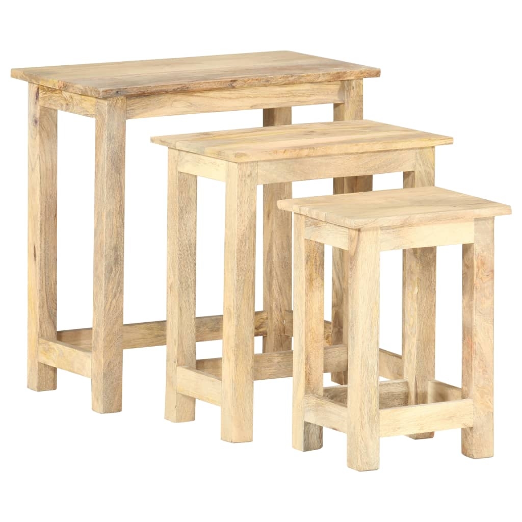 Dieses 3-teilige Satztisch-Set aus Mangoholz wird zum zeitlosen Element in Ihrem Zuhause. Sie können sie als Beistelltische, Couchtische, Lampen-/Pflanzenständer usw. verwenden. Diese Tische sind untereinander verstaubar und sparen demnach bei Nichtgebrauch viel Platz. Dieses Set aus 3 Satztischen besteht aus erstklassigem Mangoholz, wodurch jedes Möbelstück robust, stabil und langlebig ist. Die ausgeprägte Holzmaserung verleiht jedem Tisch seinen einzigartigen, unverwechselbaren Charakter. Mangoholz ist ein dichtes und robustes Hartholz, das schöne braune oder goldene Streifen und Maserungen auf seiner Oberfläche aufweist. Darüber hinaus wurde jeder Arbeitsschritt mit größter Sorgfalt durchgeführt, sei es Polieren oder Anstreichen. Wichtiger Hinweis: Die Farben variieren von Stück zu Stück, dadurch wird jedes Möbelstück zum Unikat; die Lieferung erfolgt nach dem Zufallsprinzip.
