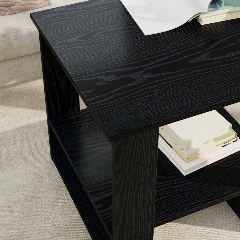 Ein Must-have für jedes moderne Wohnzimmer: dieser rechteckige Couchtisch kombiniert Funktionalität mit coolem Design. Hergestellt aus Holzwerkstoff, hat er eine luxuriöse, aber schlichte Ästhetik, die zu vielen Wohnstilen passt. Die großzügige Oberfläche ist super geeignet, um Bücher und Deko hübsch zu präsentieren und dabei einen ordentlichen Look zu bewahren. Holzwerkstoffkonstruktion Der Tisch besteht ganz aus Holzwerkstoff, der für seine Stabilität und glatte Oberfläche bekannt ist. Er widersteht Verformungen und Rissen, was ihn zu einer zuverlässigen Wahl für den Alltag macht. Sauberes und modernes Design Mit seiner schlichten und eleganten Form passt der Couchtisch wunderbar in jedes Wohnzimmer. Seine minimalistischen Linien sorgen für einen ordentlichen Look, der die moderne Atmosphäre in deinem Zuhause unterstützt. Funktionale Fläche Die große Tischplatte bietet Platz für alles, was du brauchst - von Drinks und Snacks bis zu Büchern und Deko. Die robuste Oberfläche hält gut unterschiedlichen Gewichten und Aktivitäten stand und ist perfekt für Entspannung und Unterhaltung. Regalbretter inklusive Mit einfachen, aber funktionalen Brettregalen bist du für zusätzlichen Stauraum gut ausgestattet. Sie sind perfekt für Magazine und Kleinkram und sorgen dafür, dass dein Wohnraum aufgeräumt bleibt und alles Wichtige immer griffbereit ist. Einfache Pflege Die Pflege dieses Couchtisches ist super easy. Vermeide aggressive Chemikalien; ein weiches Tuch und Wasser genügen, um den Glanz zu bewahren und die Oberfläche zu schützen.