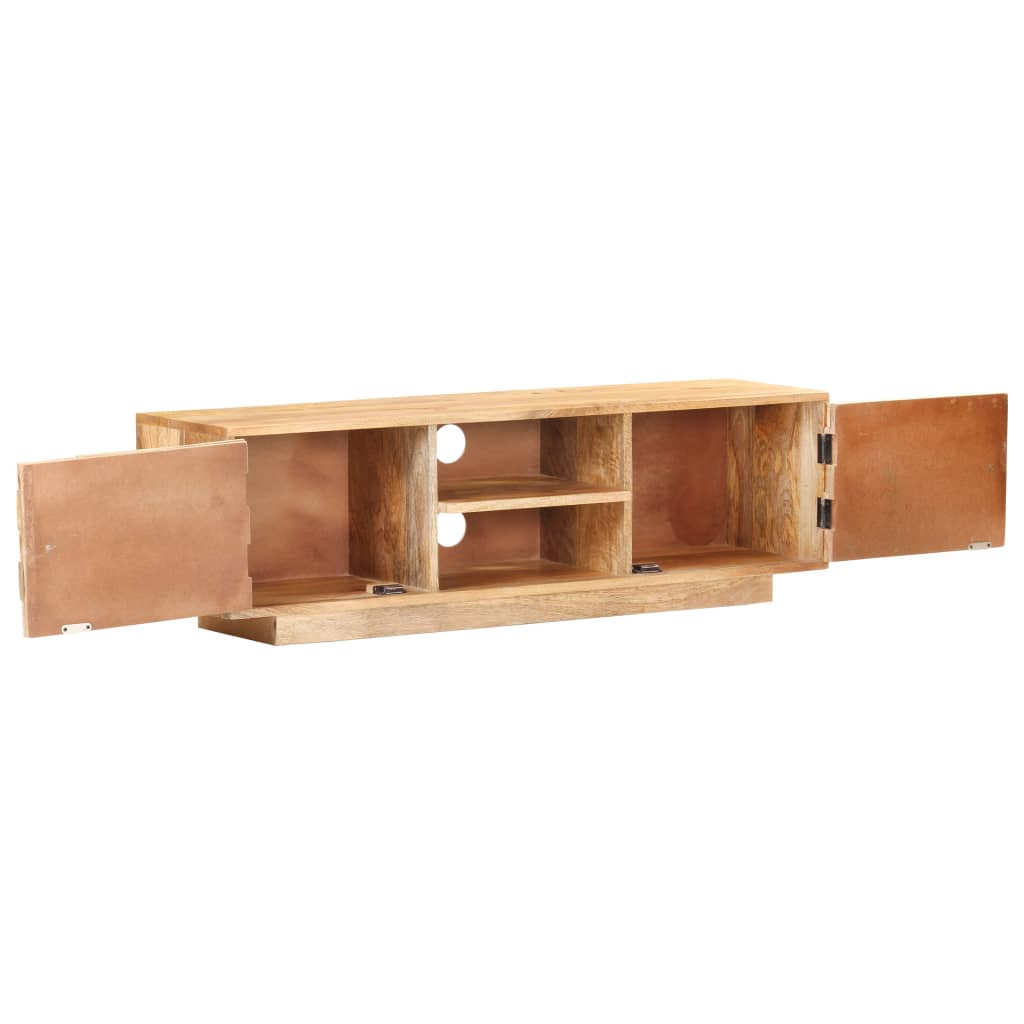Dieser hölzerne TV-Schrank im klassischen Design ist die perfekte Wahl für Ihren Wohnraum. Der Stereo-Schrank besteht aus naturbelassenem, massivem Mangoholz, einem tropischen Hartholz, das belastbar und verschleißfest ist; dadurch ist das Lowboard robust, stabil und langlebig. Die Handwerkskunst und die schöne Holzmaserung machen jedes Möbelstück zu einem Unikat. Der Fernsehschrank verfügt außerdem über zwei Türen und zwei Regale, die ausreichend Stauraum bieten. Darüber hinaus kann die robuste Oberplatte zum Ausstellen von dekorativen Objekten wie Fotorahmen, Topfpflanzen, Vasen usw. verwendet werden. Wichtiger Hinweis: Farbe und Maserung variieren von Stück zu Stück, so dass jedes Möbelstück einzigartig ist. Die Lieferung erfolgt nach dem Zufallsprinzip.