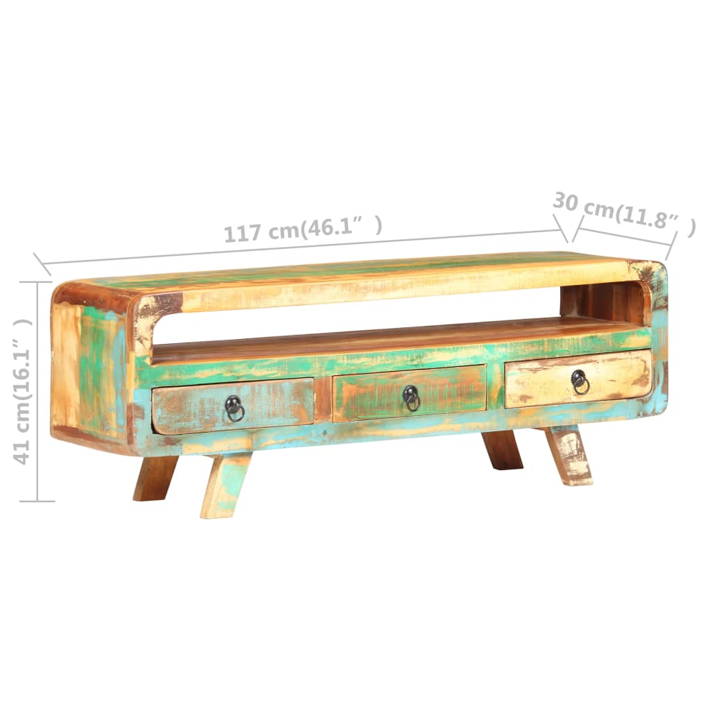 Dieser TV-Schrank aus Holz versprüht Vintage-Charme und ist eine zeitlose Ergänzung für Ihr Zuhause. Der Schrank kann auch als Seitenschrank, HiFi-Schrank, Sideboard usw. verwendet werden. Dieser TV-Schrank besteht aus massivem Altholz mit Mischfarben, was bedeutet, dass jedes Möbelstück ein Unikat ist. Möbel aus Altholz haben die Eigenschaften verschiedener Hölzer wie Teak, Mangoholz und Akazie. Altholz ist massiv, stabil, langlebig und schön. Gebrauchsspuren und sichtbare Maserung verleihen jedem Stück seine eigene Geschichte und ein einzigartiges Aussehen. Jeder Schritt des Prozesses wird mit größter Sorgfalt ausgeführt, sei es Polieren oder Lackieren. Der TV-Schrank ist vollständig handgefertigt und die Handwerkskunst trägt zu seinem spektakulären Retro-Stil bei. Jeder Schritt des Prozesses wird mit größter Sorgfalt ausgeführt, sei es Rekombinieren, Polieren, Streichen oder Wachsen. Das Lowboard verfügt über 3 Schubladen zur Aufbewahrung von Schnickschnack und ein Regal zur Aufbewahrung von Multimedia-Geräten, Spielekonsolen und Zeitschriften. Wichtiger Hinweis: Die Farben variieren von Produkt zu Produkt, so dass jeder TV-Schrank einzigartig ist; die Lieferung erfolgt zufällig.
