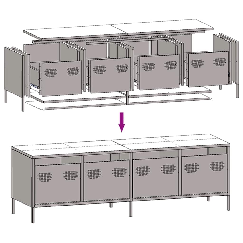 Dieser robuste TV-Schrank im Industrie-Stil ist eine zeitlose Ergänzung zu deinem Schlafzimmer oder Wohnzimmer. Stabiles Material: Das Gestell des TV-Schranks besteht aus kaltgewalztem Stahl. Dies ist eine Art kohlenstoffarmer Stahl, der im „Kaltwalzverfahren“ hergestellt und bei nahezu normalen Raumtemperaturen verarbeitet wird. Kaltgewalzter Stahl besitzt eine glattere Oberfläche, eine höhere Festigkeit und lässt sich präziser verarbeiten.Reichlich Stauraum: Mit 4 Schubladen versehen, bietet der Schrank reichlich Platz, um verschiedene Alltagssachen ordentlich und griffbereit aufzubewahren.Verstellbare Stellfüße: Dieses TV-Möbel ist mit vier Stellfüßen ausgestattet, um Bodenunebenheiten auszugleichen und Stabilität und Gleichgewicht zu gewährleisten.Einfache Reinigung: Der Schrank aus Metall ist mit einem feuchten Tuch leicht zu reinigen und erfordert wenig Pflege.