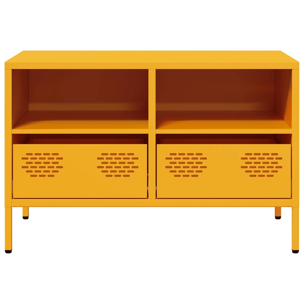 Dieser robuste TV-Schrank im Industrie-Stil ist eine zeitlose Ergänzung zu deinem Schlafzimmer oder Wohnzimmer. Stabiles Material: Das Gestell des TV-Schranks besteht aus kaltgewalztem Stahl. Dies ist eine Art kohlenstoffarmer Stahl, der im „Kaltwalzverfahren“ hergestellt und bei nahezu normalen Raumtemperaturen verarbeitet wird. Kaltgewalzter Stahl besitzt eine glattere Oberfläche, eine höhere Festigkeit und lässt sich präziser verarbeiten.Viel Stauraum: Der Schrank ist mit 2 Fächern sowie 2 Schubladen versehen und bietet dadurch viel Platz, um verschiedene Alltagssachen gut organisiert und in Reichweite aufzubewahren.Verstellbare Stellfüße: Dieses TV-Möbel ist mit vier Stellfüßen ausgestattet, um Bodenunebenheiten auszugleichen und Stabilität und Gleichgewicht zu gewährleisten.Einfache Reinigung: Der Schrank aus Metall ist mit einem feuchten Tuch leicht zu reinigen und erfordert wenig Pflege.