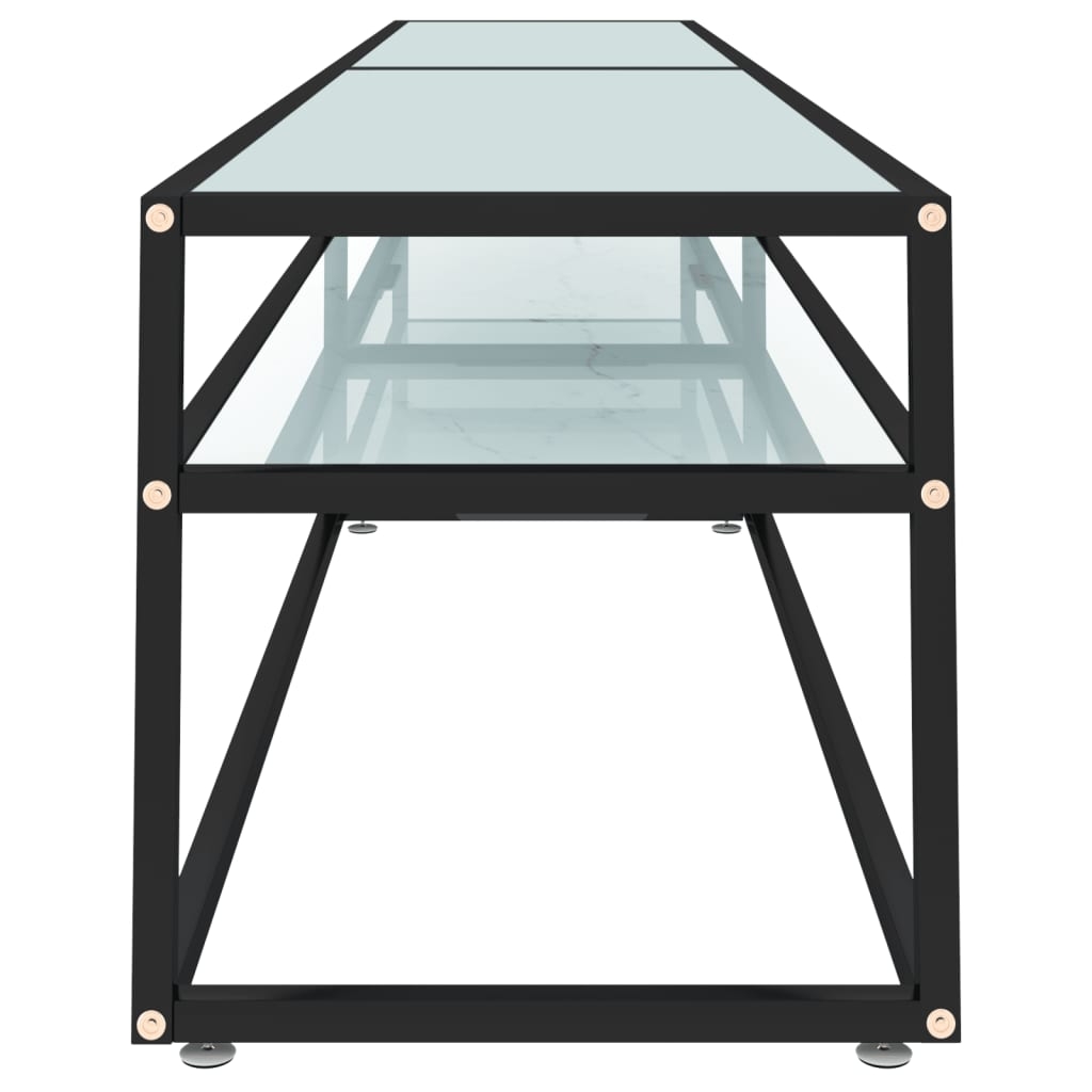 Dieser TV-Schrank mit seinem schlanken und stromlinienförmigen Design ist eine praktische Ergänzung zu Ihrem bestehenden Wohnraum. Dieser Stereo-Schrank besteht aus gehärtetem Glas, ist robust und stabil. Es ist auch leicht mit einem feuchten Tuch zu reinigen. Der pulverbeschichtete Stahlrahmen trägt zu seiner Robustheit bei. Die Ablage unter der Tischplatte bietet reichlich Stauraum, um DVDs, Multimedia-Geräte, Bücher und kleine, wichtige Dinge geordnet und griffbereit aufzubewahren.