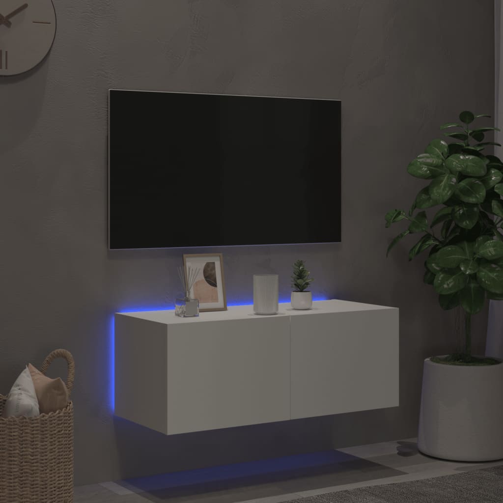 Dieser TV-Wandschrank bietet die perfekte Lösung, um zusätzlichen Stauraum in deinem Wohnraum zu schaffen und für Ordnung zu sorgen. Langlebiges Material: Holzwerkstoff ist ein Material von außergewöhnlicher Qualität mit glatter Oberfläche, das sich durch Festigkeit, Stabilität und Feuchtigkeitsbeständigkeit auszeichnet.RGB-LED-Beleuchtung: Der Wandschrank ist mit lebendigen RGB-LED-Leuchten ausgestattet. Mit verschiedenen anpassbaren Menüs kannst du die Farbe der Lichter mühelos wechseln und sie sogar auf automatische Anpassung einstellen. Diese LED-Leuchten unterstreichen nicht nur den modernen Look des TV-Schwebeschranks, sondern tragen auch zu seinem trendigen Design bei.Reichlich Stauraum: Der TV-Wandschrank verfügt über 2 Fächer hinter den Türen, die reichlich Platz bieten, um verschiedene Kleinigkeiten wie Bücher, DVDs und Zeitschriften ordentlich und griffbereit aufzubewahren.Vielseitig: Der Schrank lässt sich vielseitig einsetzen und sowohl als TV-Konsole als auch als Wand-Nachttisch verwenden. Du kannst ihn auch mit anderen Schränken kombinieren, um eine atemberaubende Wohnwand zu schaffen.Wandmontage: Der LED-Schrank lässt sich an der Wand montieren, um zusätzlichen Stauraum zu schaffen. Auf diese Weise kannst du deine Bodenfläche maximieren und für Ordnung im Raum sorgen. Gut zu wissen:Schrauben und Dübel für die Innenseite der Wand sind nicht enthalten. Wir empfehlen dir, Schrauben und Dübel zu finden und zu verwenden, die speziell für deine Wände geeignet sind. Wenn du dir nicht sicher bist, kannst du dich an einen Fachmann wenden. Bitte lies und befolge jeden Schritt in der Anleitung.Das Produkt verfügt über einen USB-Anschluss, für den eine zertifizierte 5V-USB-Stromquelle erforderlich ist (nicht im Lieferumfang enthalten).