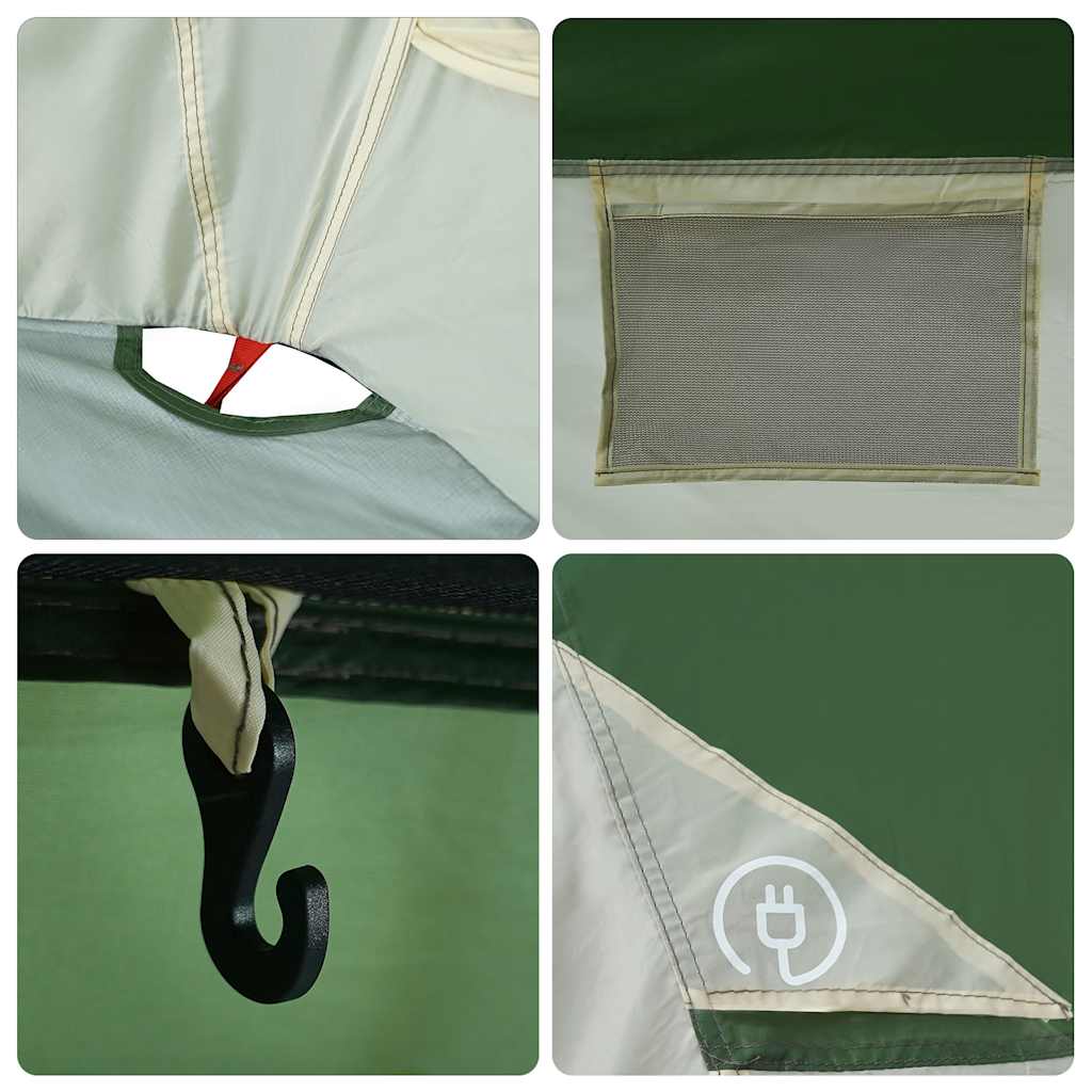 Dieses moderne Familienzelt schützt vor unangenehmen Wetter und bietet einen komfortablen Platz bei Abenteuern. Rundum wasserdichtes Design: Aus Polyester mit PU-Beschichtung gefertigt, ist dieses Campingzelt wasser- und winddicht. Die versiegelten Nähte verhindern effektiv das Eindringen von Regenwasser, während die strapazierfähige Bodenplane für ein trockenes und komfortables Interieur sorgt.Einfacher Auf- und Abbau: Die hochflexiblen und leichten Glasfaserstangen und das praktische Steckverbindungssystem machen den Auf- und Abbau des Zeltes zum Kinderspiel.Abnehmbares Überzelt: Das abnehmbare Überzelt lässt sich an der Zeltoberseite befestigen, um Wetterschutz zu bieten und Privatsphäre zu schaffen.Praktischer Zugang zum Stromkabel: Dank des E-Anschlusses kannst du ganz einfach ein Verlängerungskabel von einer externen Stromquelle an dein Zelt anschließen.Leicht und tragbar: Dank des faltbaren und leichten Designs lässt sich das Zelt einfach verpacken und in der mitgelieferten Tragetasche mühelos verstauen und transportieren. Achtung:Halte alle Flammen und Wärmequellen von diesem Zeltstoff fern.