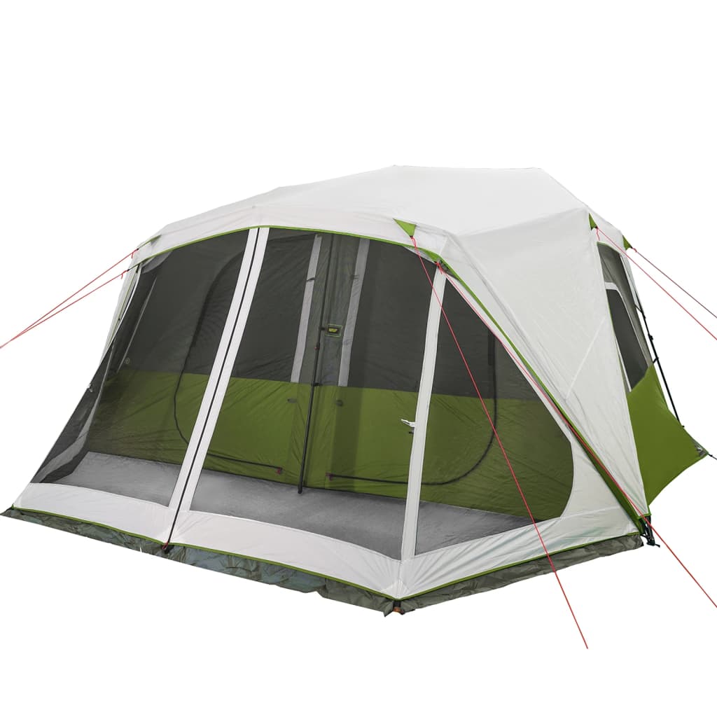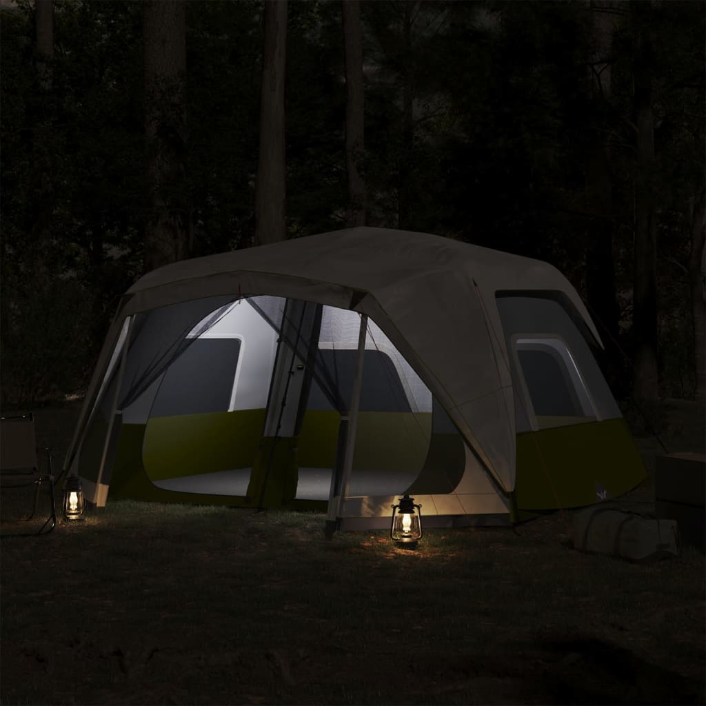 Dieses moderne Familienzelt schützt vor unangenehmen Wetter und bietet einen komfortablen Platz bei Abenteuern. Rundum wasserdichtes Design: Aus Polyester mit PU-Beschichtung gefertigt, ist dieses Campingzelt wasser- und winddicht. Die versiegelten Nähte verhindern effektiv das Eindringen von Regenwasser, während die strapazierfähige Bodenplane für ein trockenes und komfortables Interieur sorgt. Quick-Release-System: Dank des Quick-Release-Systems lässt sich das Zelt mühelos aufbauen! Lege das Zelt auf den Boden, ziehe das vormontierte Gestänge heraus, bis es einrastet, und schon ist das Zelt einsatzbereit!LED-Beleuchtung: Dieses Zelt ist mit LED-Leuchten ausgestattet. Diese haben drei Helligkeitsstufen: Hoch, Niedrig und Nachtlicht. Die Zeltbeleuchtung kann entweder mit einer Powerbank oder mit 4D-Batterien betrieben werden (keine davon ist im Lieferumfang enthalten). Der lichtstreuende Stoff sorgt für eine gleichmäßige Beleuchtung im gesamten Zelt und schafft so eine gemütliche und gut beleuchtete Umgebung für all deine Camping-Abenteuer.Praktischer Zugang zum Stromkabel: Dank des E-Anschlusses kannst du ganz einfach ein Verlängerungskabel von einer externen Stromquelle an dein Zelt anschließen.Abnehmbares Überzelt: Das abnehmbare Überzelt lässt sich an der Zeltoberseite befestigen, um Wetterschutz zu bieten und Privatsphäre zu schaffen. Achtung:Halte alle Flammen und Wärmequellen von diesem Zeltstoff fern.