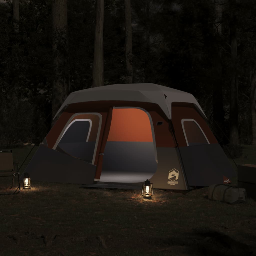 Dieses moderne Familienzelt schützt vor unangenehmen Wetter und bietet einen komfortablen Platz bei Abenteuern. Rundum wasserdichtes Design: Aus Polyester mit PU-Beschichtung gefertigt, ist dieses Campingzelt wasser- und winddicht. Die versiegelten Nähte verhindern effektiv das Eindringen von Regenwasser, während die strapazierfähige Bodenplane für ein trockenes und komfortables Interieur sorgt. Quick-Release-System: Dank des Quick-Release-Systems lässt sich das Zelt mühelos aufbauen! Lege das Zelt auf den Boden, ziehe das vormontierte Gestänge heraus, bis es einrastet, und schon ist das Zelt einsatzbereit!LED-Beleuchtung: Dieses Zelt ist mit LED-Leuchten ausgestattet. Diese haben drei Helligkeitsstufen: Hoch, Niedrig und Nachtlicht. Die Zeltbeleuchtung kann entweder mit einer Powerbank oder mit 4D-Batterien betrieben werden (keine davon ist im Lieferumfang enthalten). Der lichtstreuende Stoff sorgt für eine gleichmäßige Beleuchtung im gesamten Zelt und schafft so eine gemütliche und gut beleuchtete Umgebung für all deine Camping-Abenteuer.Praktischer Zugang zum Stromkabel: Dank des E-Anschlusses kannst du ganz einfach ein Verlängerungskabel von einer externen Stromquelle an dein Zelt anschließen.Abnehmbares Überzelt: Das abnehmbare Überzelt lässt sich an der Zeltoberseite befestigen, um Wetterschutz zu bieten und Privatsphäre zu schaffen. Achtung:Halte alle Flammen und Wärmequellen von diesem Zeltstoff fern.