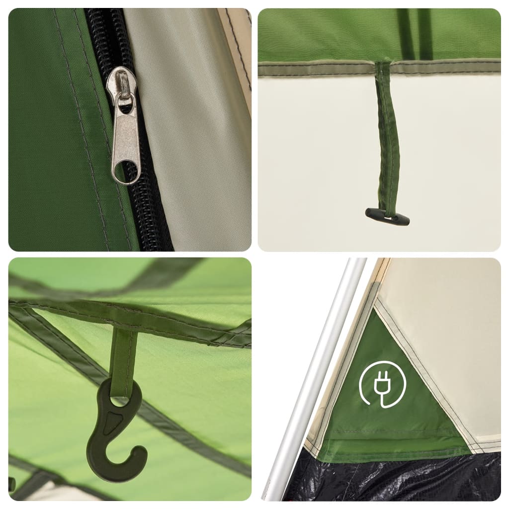 Dieses moderne Familienzelt schützt vor unangenehmen Wetter und bietet einen komfortablen Platz bei Abenteuern. Rundum wasserdichtes Design: Aus Polyester mit PU-Beschichtung gefertigt, ist dieses Campingzelt wasser- und winddicht. Die versiegelten Nähte verhindern effektiv das Eindringen von Regenwasser, während die strapazierfähige Bodenplane für ein trockenes und komfortables Interieur sorgt.Quick-Release-System: Dank des Quick-Release-Systems lässt sich das Zelt mühelos aufbauen! Lege das Zelt auf den Boden, ziehe das vormontierte Gestänge heraus, bis es einrastet, und schon ist das Zelt einsatzbereit!Abnehmbares Überzelt: Das abnehmbare Überzelt lässt sich an der Zeltoberseite befestigen, um Wetterschutz zu bieten und Privatsphäre zu schaffen.Praktischer Zugang zum Stromkabel: Dank des E-Anschlusses kannst du ganz einfach ein Verlängerungskabel von einer externen Stromquelle an dein Zelt anschließen.Leicht und tragbar: Dank des faltbaren und leichten Designs lässt sich das Zelt einfach verpacken und in der mitgelieferten Tragetasche mühelos verstauen und transportieren. Achtung:Halte alle Flammen und Wärmequellen von diesem Zeltstoff fern.