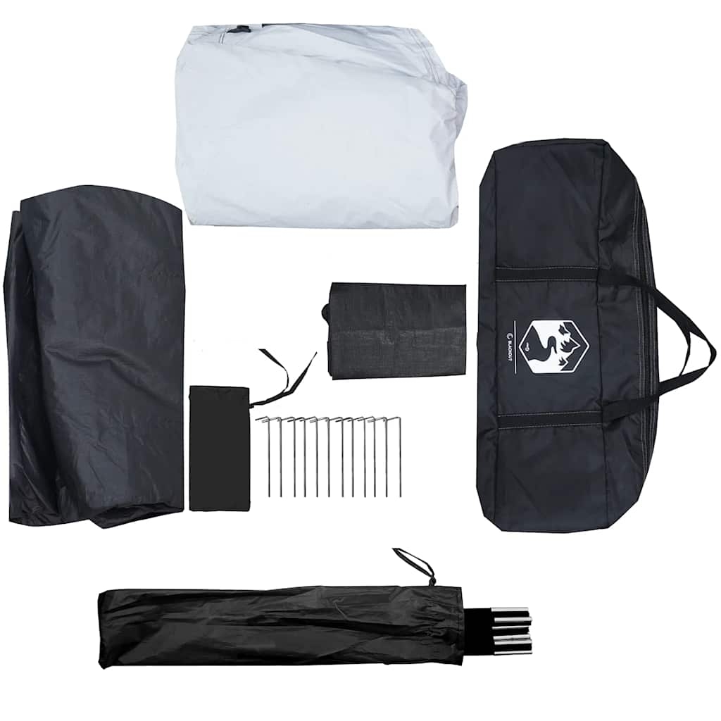 Dieses moderne Familienzelt schützt vor unangenehmen Wetter und bietet einen komfortablen Platz bei Abenteuern. Rundum wasserdichtes Design: Aus Polyester mit PU-Beschichtung gefertigt, ist dieses Campingzelt wasser- und winddicht. Die versiegelten Nähte verhindern effektiv das Eindringen von Regenwasser, während die strapazierfähige Bodenplane für ein trockenes und komfortables Interieur sorgt.Weißer Verdunkelungsstoff: Die speziell entworfene Zeltplane hält 99 % des Tageslichtes ab und sorgt so für eine kühlere und bequemere Schlafumgebung. Verabschiede dich also von der Morgensonne und genieße einen erholsamen Schlaf.Abnehmbares Überzelt: Das abnehmbare Überzelt lässt sich an der Zeltoberseite befestigen, um Wetterschutz zu bieten und Privatsphäre zu schaffen.Gute Belüftung und Insektenschutz: Die Netzwände bieten nicht nur eine hervorragende Belüftung, sondern halten auch Insekten effektiv fern, um den Benutzern ein komfortables und insektenfreies Erlebnis zu bieten.Praktischer Zugang zum Stromkabel: Dank des E-Anschlusses kannst du ganz einfach ein Verlängerungskabel von einer externen Stromquelle an dein Zelt anschließen.Einfacher Auf- und Abbau: Die hochflexiblen und leichten Glasfaserstangen und das praktische Steckverbindungssystem machen den Auf- und Abbau des Zeltes zum Kinderspiel. Achtung:Halte alle Flammen und Wärmequellen von diesem Zeltstoff fern.