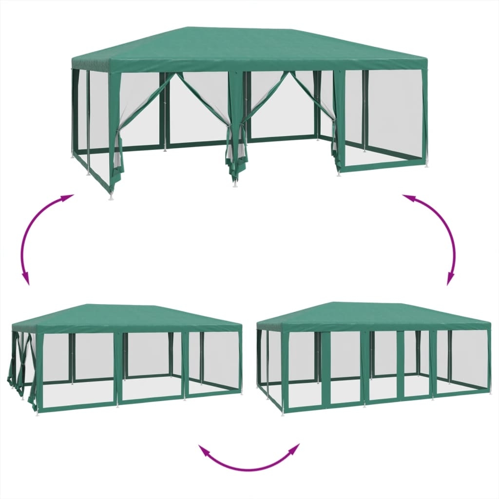 Mit seinem robusten Eisenrahmen, dem wasserfesten Dach und den zehn Mesh-Seitenwänden bietet dieses tolle Partyzelt den idealen Schutz vor der Sonne. Erstklassiges Material: Dieser Pavillon besteht aus Polyethylen hoher Dichte (HDPE), das dich vor direkter Sonneneinstrahlung schützt und eine ausreichende Belüftung ermöglicht. Das HDPE wurde speziell behandelt, sodass es auch wasserfest ist.Eisengestell: Das Eisengestell verleiht dem Gartenzelt Robustheit und Stabilität.Praktisches Design: Das Zelt ist mit zehn Mesh-Seitenteilen versehen, um Schutz vor lästigen Insekten zu bieten. Ein Seitenteil ist mit 2 Reißverschlüsse versehen, um einen einfachen Zugang zu ermöglichen.Breite Anwendung: Dieses Partyzelt ist eine ideale Wahl für eine Vielzahl von Veranstaltungen im Freien wie Shows, Hochzeiten, Partys, Grillpartys, Festivals usw. Gut zu wissen:Dieses Produkt sollte NIEMALS bei schlechtem Wetter wie starkem Wind, starkem Regen, Schnee, Sturm usw. verwendet werden.
