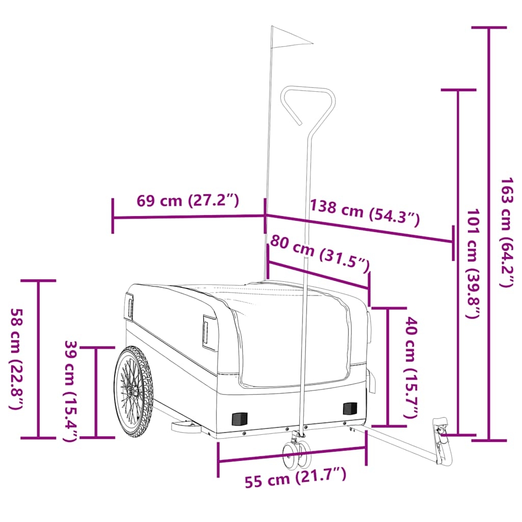 Dieser vielseitige und robuste Fahrradanhänger ist dank seiner maximalen Zuladung von 45 kg ideal für den Transport schwerer Güter. Robustes Material: Eisen ist ein starkes und hartes Material. Im Industrie- und Möbelbau ist es sehr geschätzt. Dieser Fahrrad-Lastenanhänger aus Eisen ist sehr robust und langlebig.Praktisches Design: Dieser Fahrrad-Lastenanhänger mit einer maximalen Tragfähigkeit von 45 kg ist perfekt für den Transport von schweren Gütern wie Gepäck, Pflanzen, Werkzeug oder Lebensmitteln.Cleveres Design: Der Fahrradanhänger hat eine Deichsel, mit der er leicht an ein Fahrrad angeschlossen werden kann. Gleichzeitig ist eine Sicherheitsflagge für zusätzliche Sichtbarkeit angebracht.