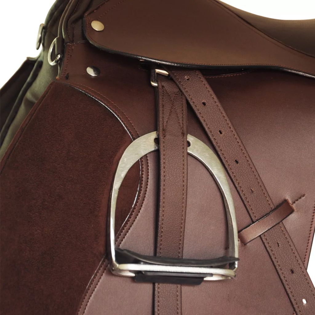 Das Sattelset mit einem Sattel, einer Satteldecke, zwei Steigbügel, einem Steigbügelhalter und eienm Gurt ist darum konzipiert, Sie in der richtigen Position zu versetzen und stellt beim Reitern Ihre Sicherheit und Gleichgewicht sicher. Der gute Sattel aus hochwertigem echtem Leder (100 %) ist eine Vereinigung von Kunst und Zweckmäßigkeit. Der Sattel ist an allen Druckpunkten für zusätzliche Haltbarkeit verstärkt. Die Satteldecke ist für Komfort der Pferde gut gepolstert und kann für einfache Reinigung abgenimmt werden. Die Steigbügel aus Mental sind solid genug für langjährige Nutzung. Beide Steigbügelhalter und der Gurt sind haltbar, um Ihre Sicherheit beim Reitern sicherzustellen. Der leichte Sitz ist sehr gemütlich, wenn Sie für einige Stunde auf dem Weg sind. Außerdem ist er ziemlich einfach zu satteln.